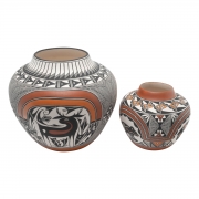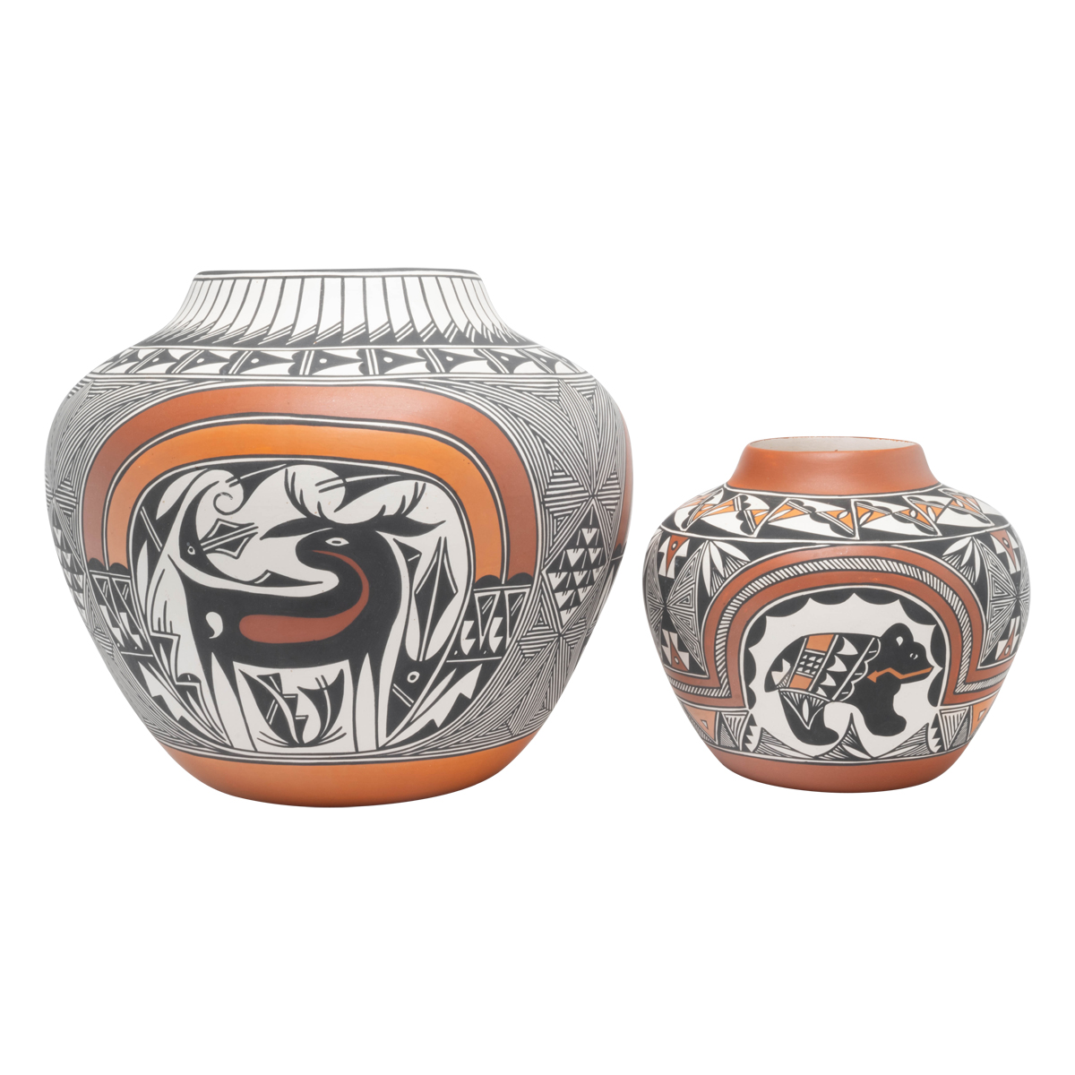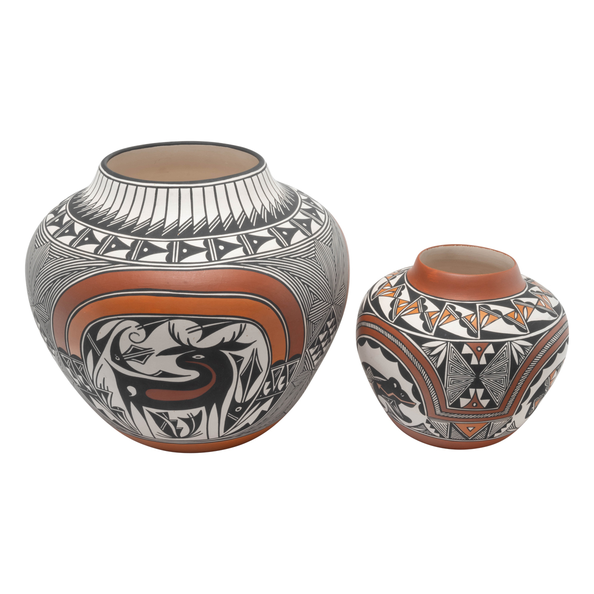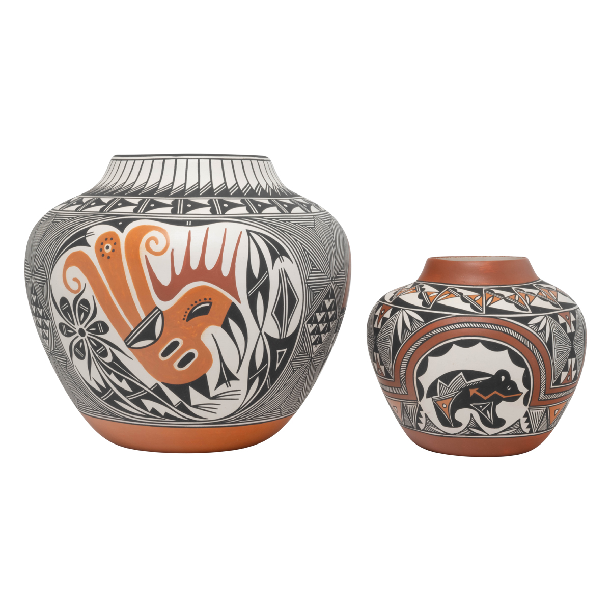 The larger olla with inverted rim, high shoulder, gradual taper to the round foot, black, orange and red decoration on a white ground, various animals within geometric framework smaller vessel with inverted rim, high shoulder, gradual taper to the round foot, red, orange, and black decoration on a white ground, bear motif within a geometric framework.