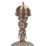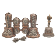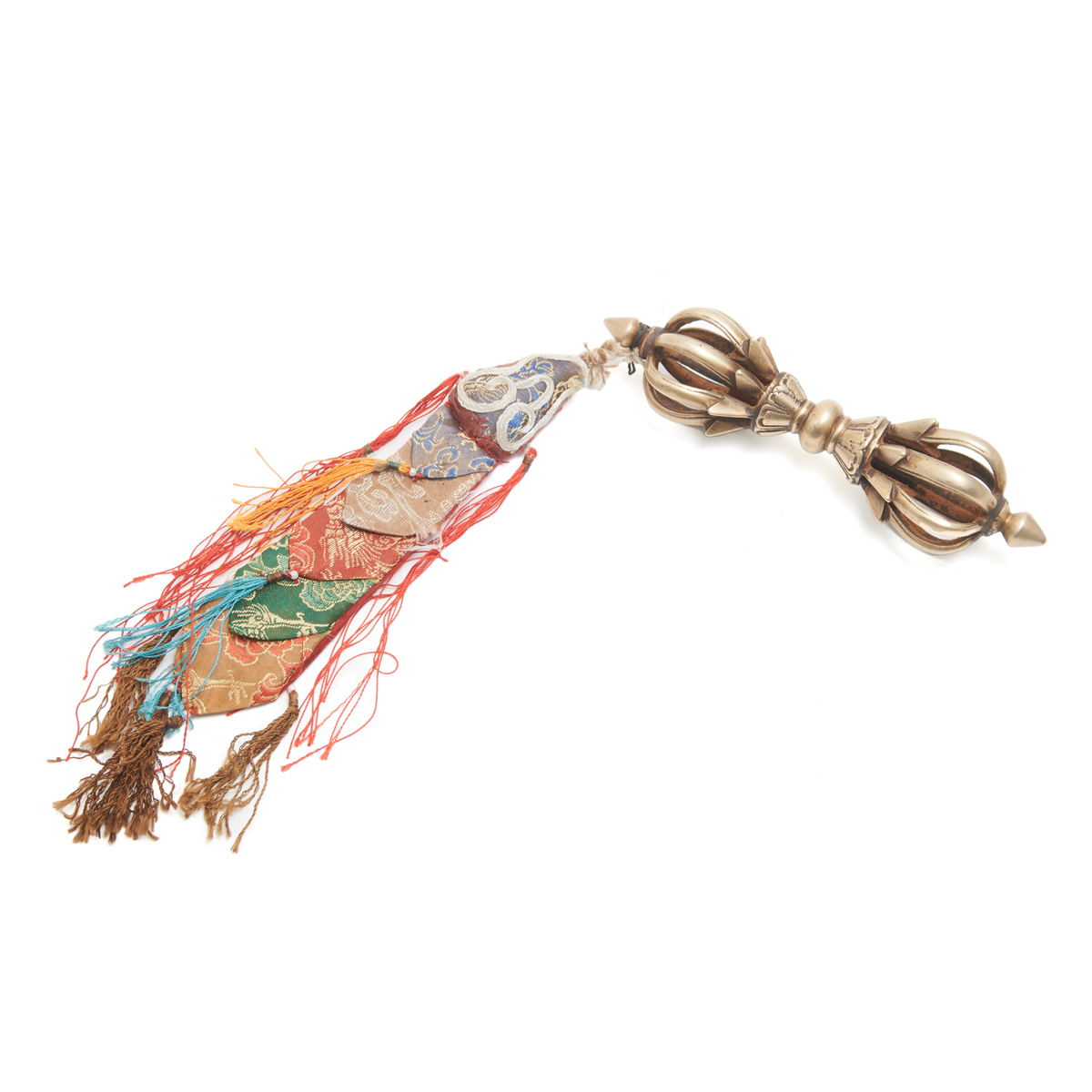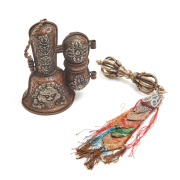 Comprising: a thunderbolt scepter cast with a central compressed bulb form, flanked by two pedestals supporting a central column, within eight arched vajra points issuing from the jaws of a makara head and an embroidered tassel attached to one end a set of bell and vajra enclosed in a custom case decorated with embossed Bagua pattern and animal face, the Vajra in the form of thunderbolt scepter flanked by two lotus form pedestals, the bell cast with relief decoration offerings of vajras, the handle with a crowned Bodhisattva-head surmounted by a vajra finial.