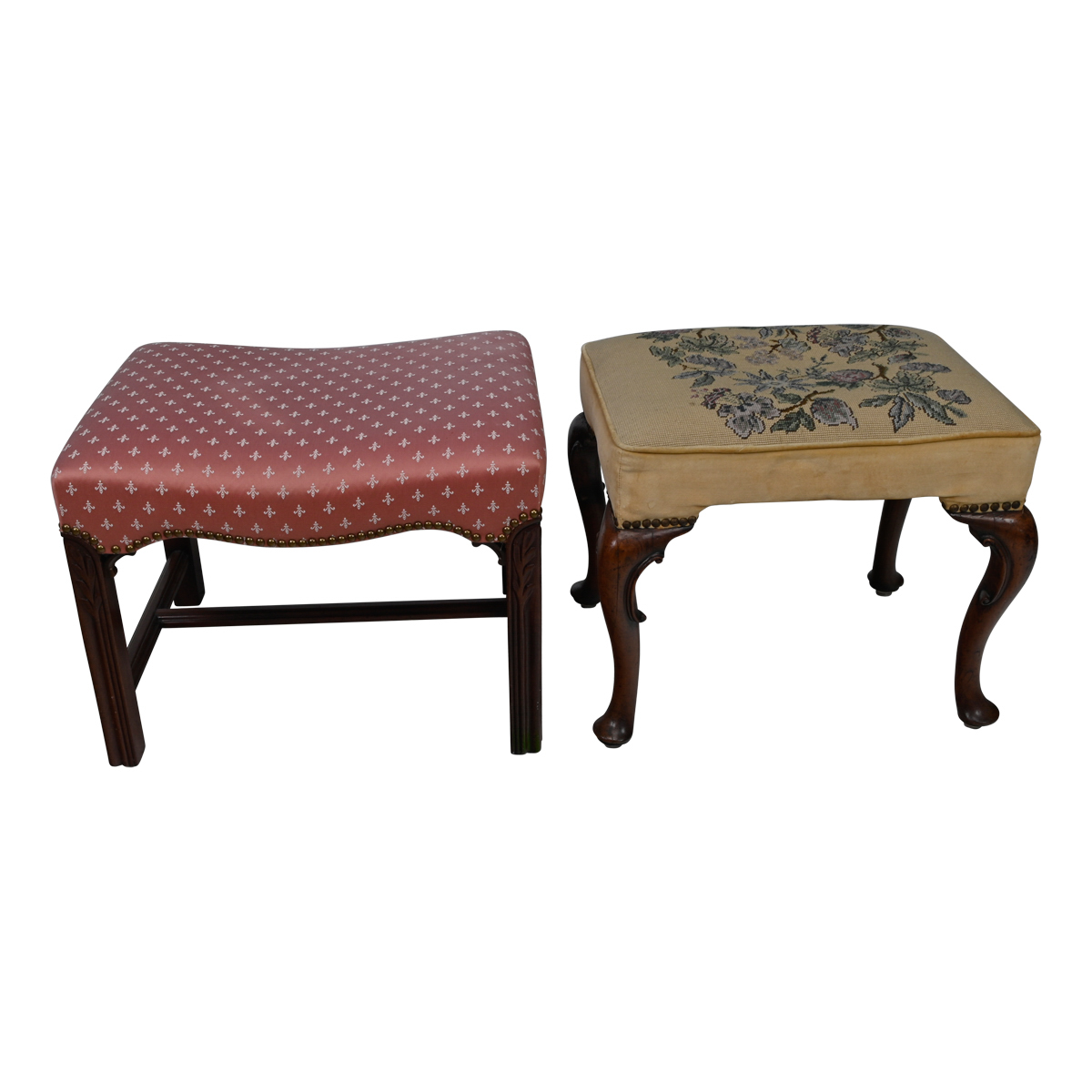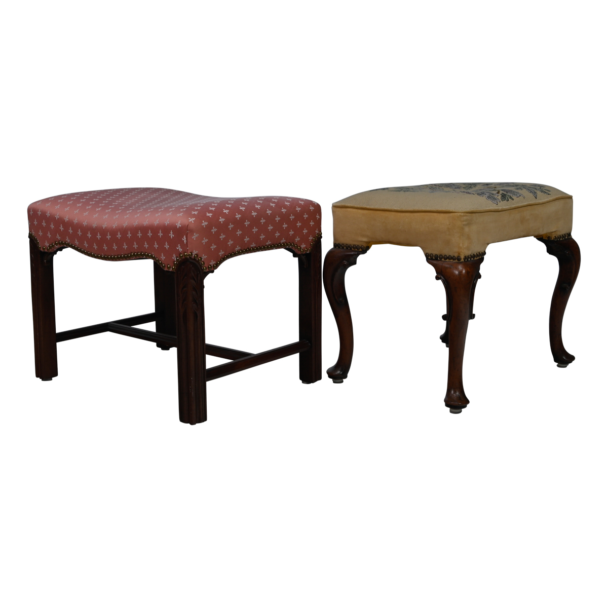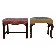 Example with needlework seat on cabriole legs, and an example with red fleur de lis pattern silk seat with arts and crafts carved base.