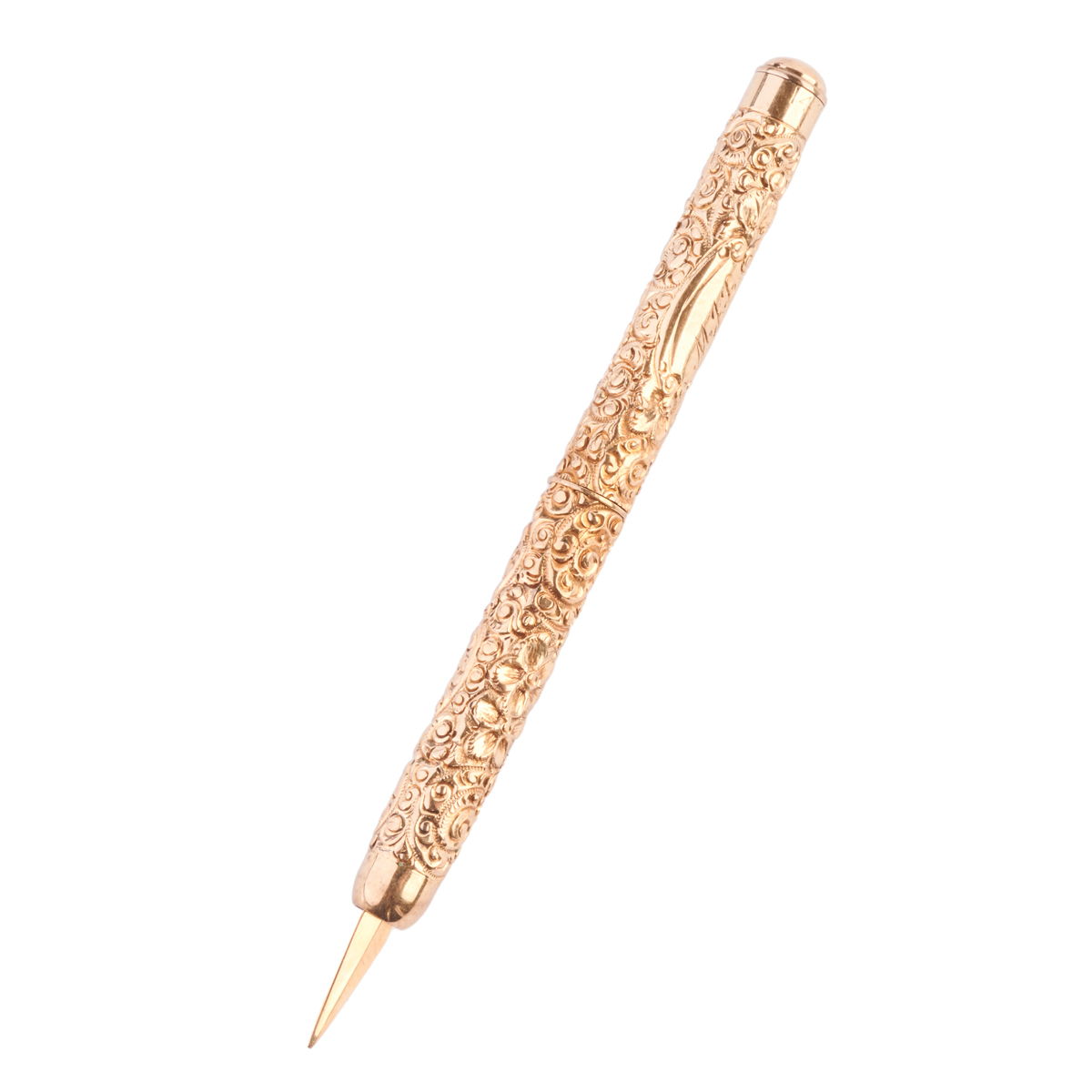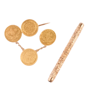 Including one 14k yellow gold embossed foliate and scrolling motif nail pick measuring approximately 77 mm fully extended and with engraved initials M.J.L. together with a 22k yellow gold coin form, 14k yellow gold brooch.