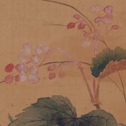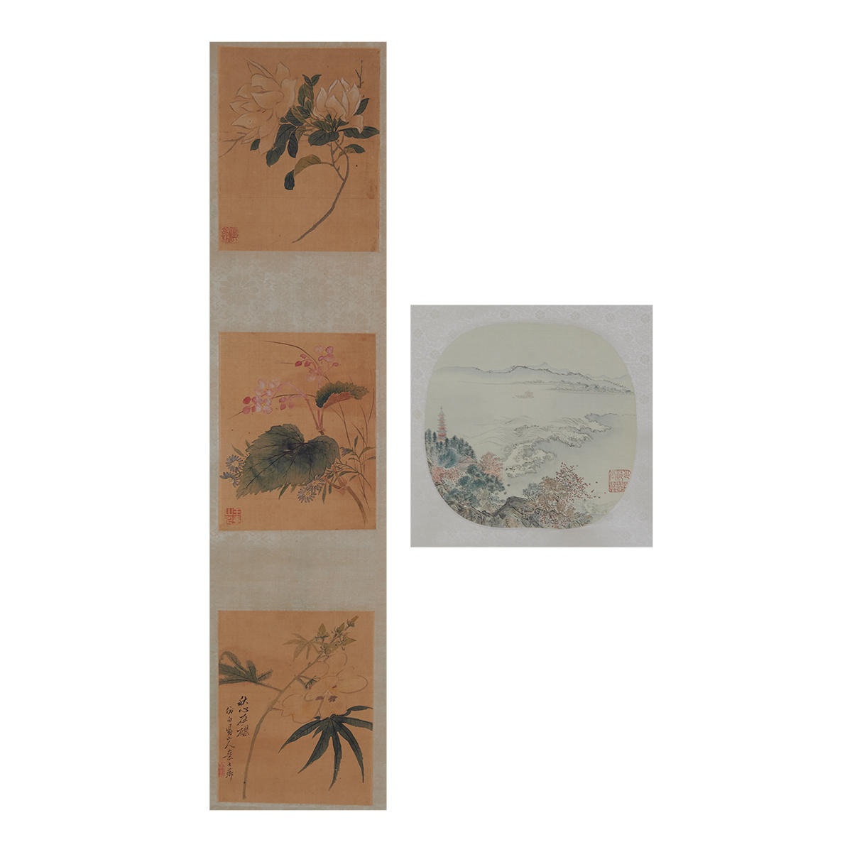 Comprising: an ink and color on silk oval form fan landscape painting, bearing a red seal to the lower right corner, together with a hanging scroll contains set of four ink and color on silk seasonal flowers, each painting bears a red seal to the left lower corner with a title slip.