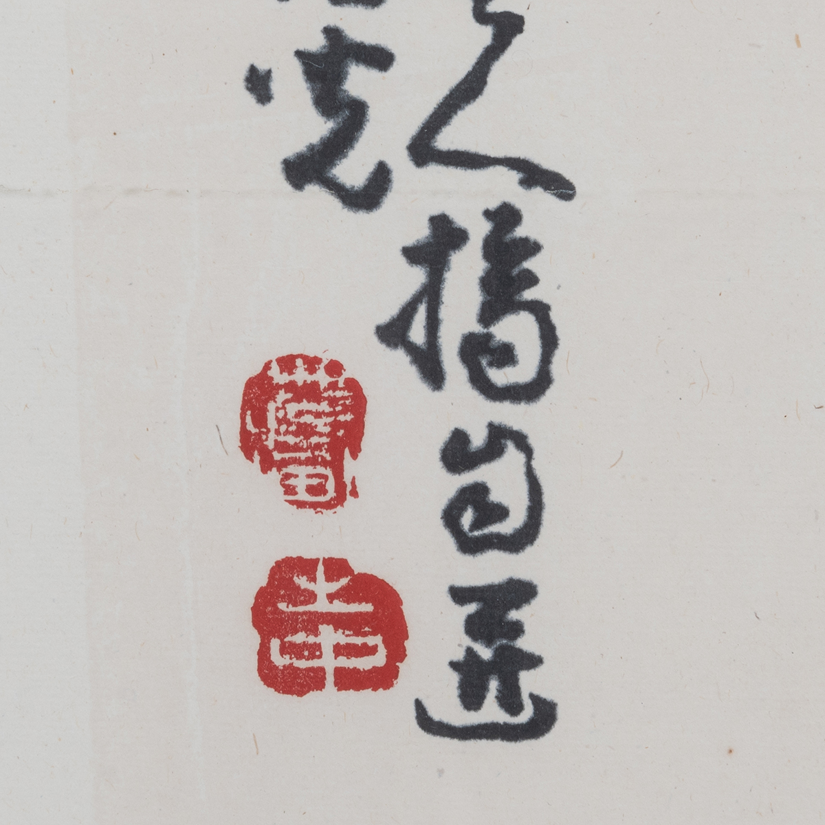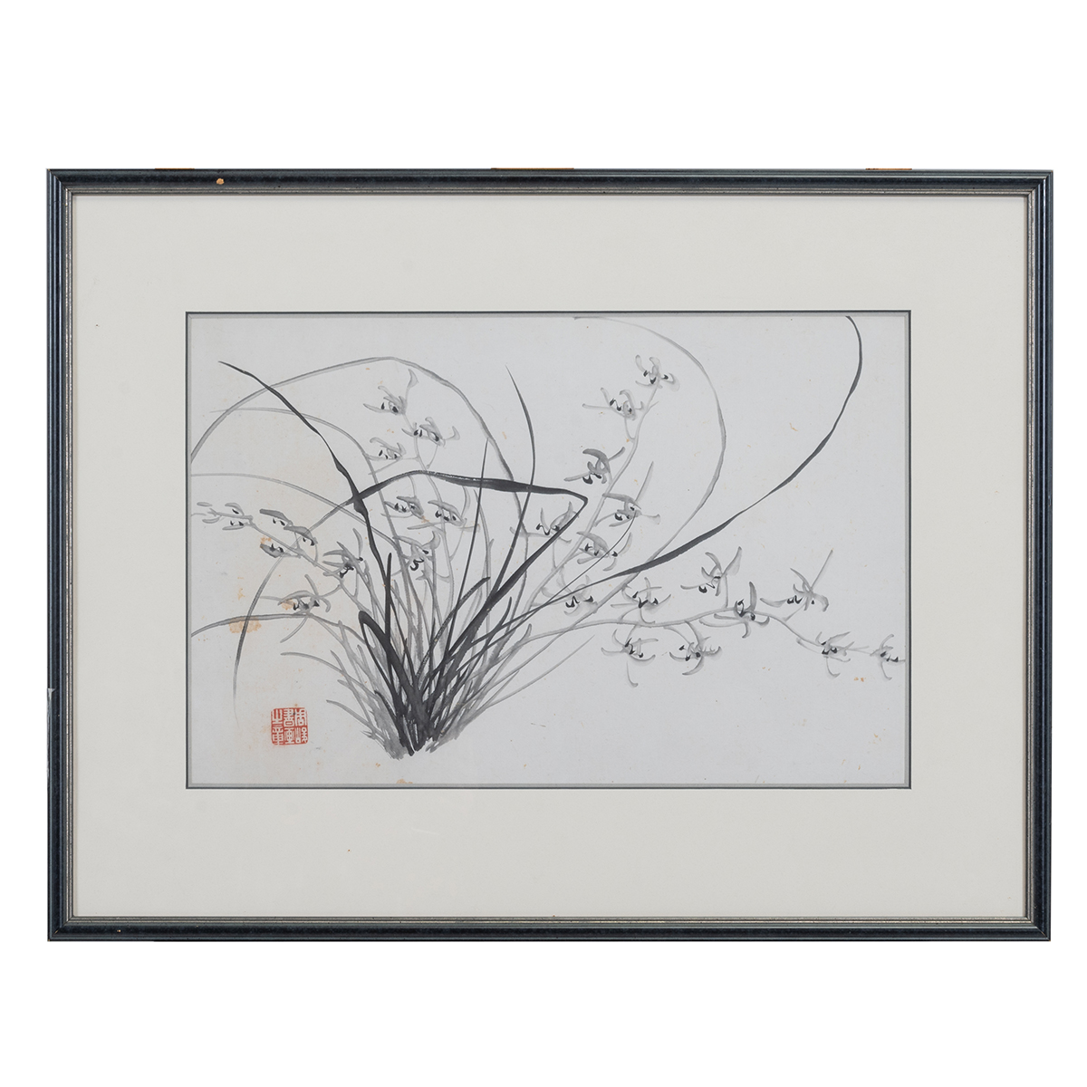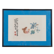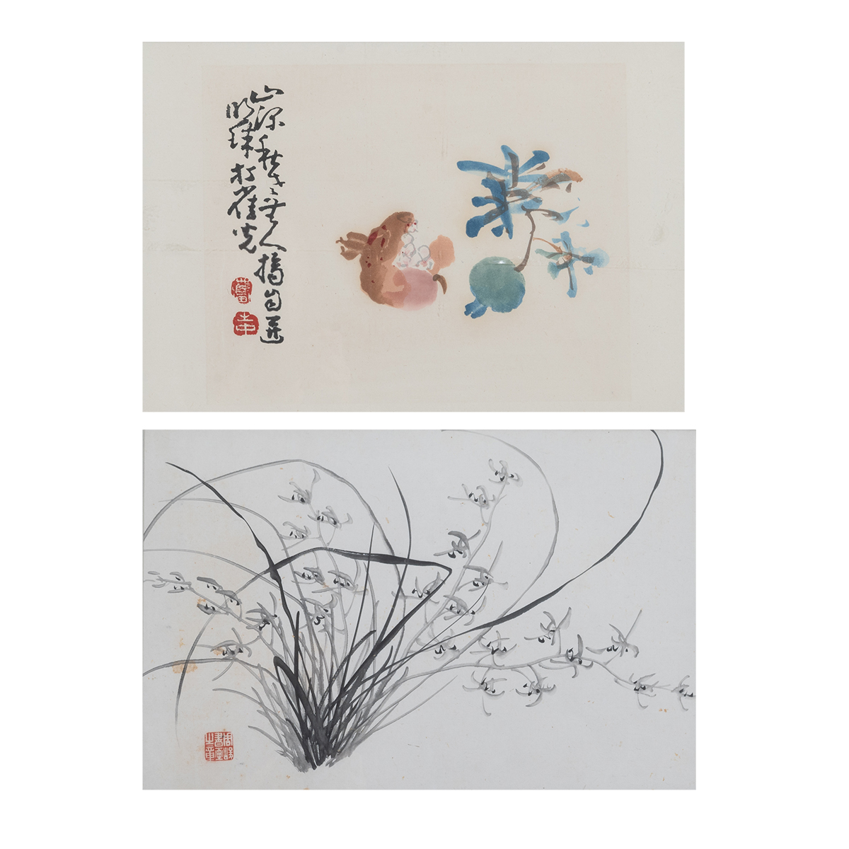 The first, ink on paper depicting orchids with a seal on the lower left side. And the second is ink and color on paper inscribed with seals depicting pomegranate. Framed and glazed.
