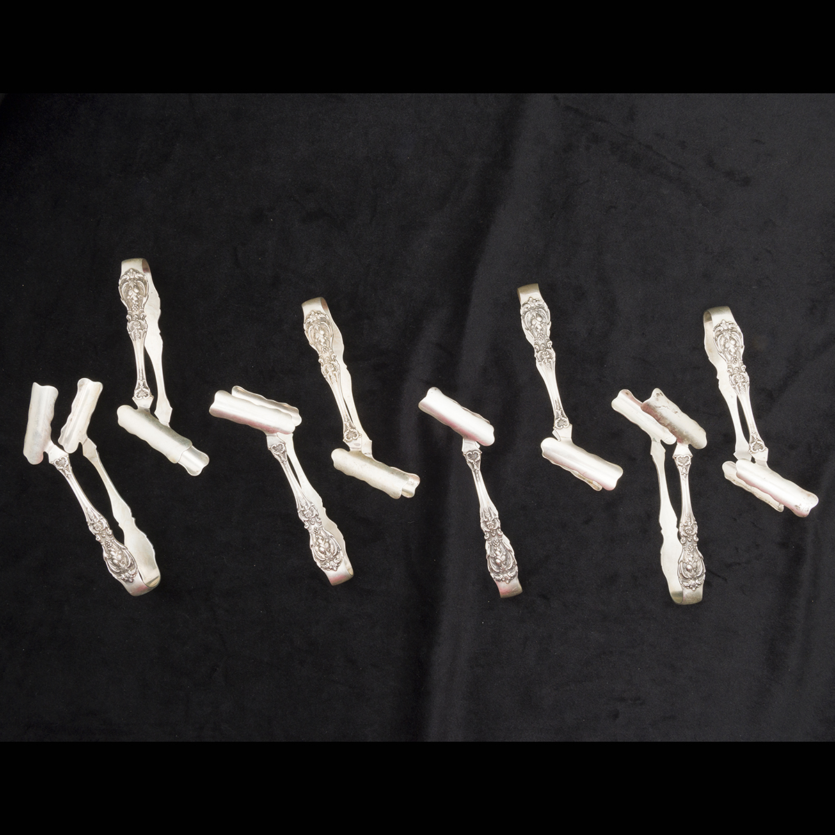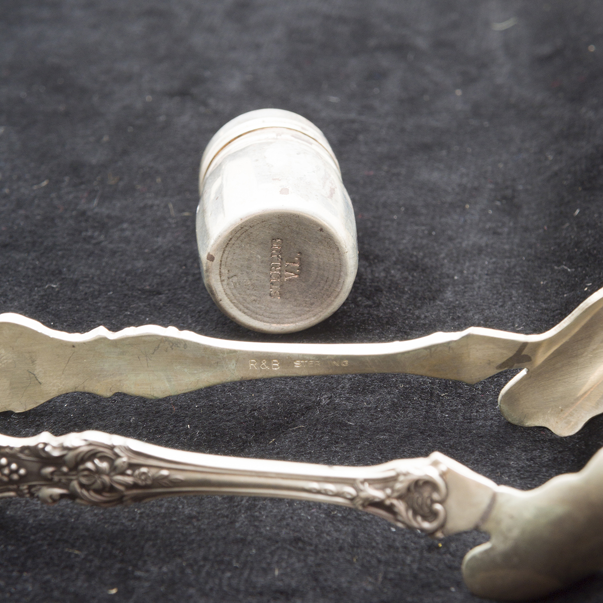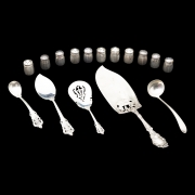 Comprising Wallace Grand Baroque jelly server, bon bon spoon, and mustard spoon set of 8 asparagus tongs, Gorham cream ladle, Gorham Lily pattern serving piece, cased set of 6 small shakers, set of 5 small shakers.
