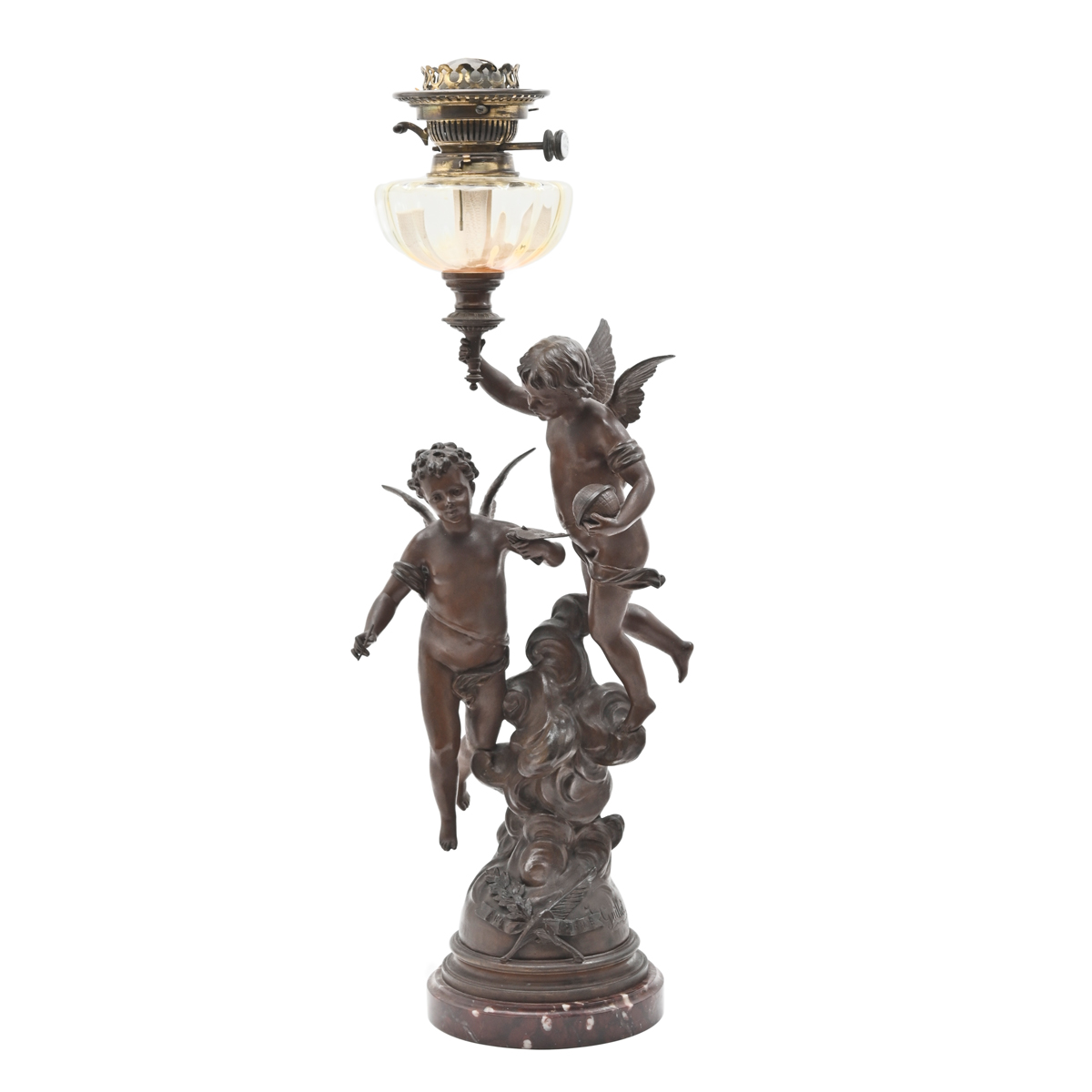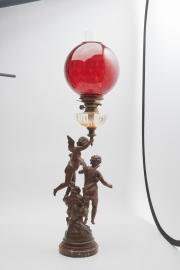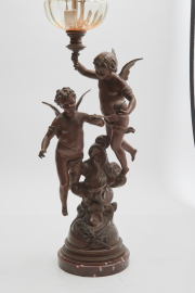 Painted spelter figural base with putti over clouds, round red marble base with ART SCIENCE to the base.