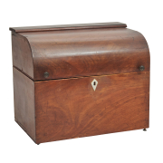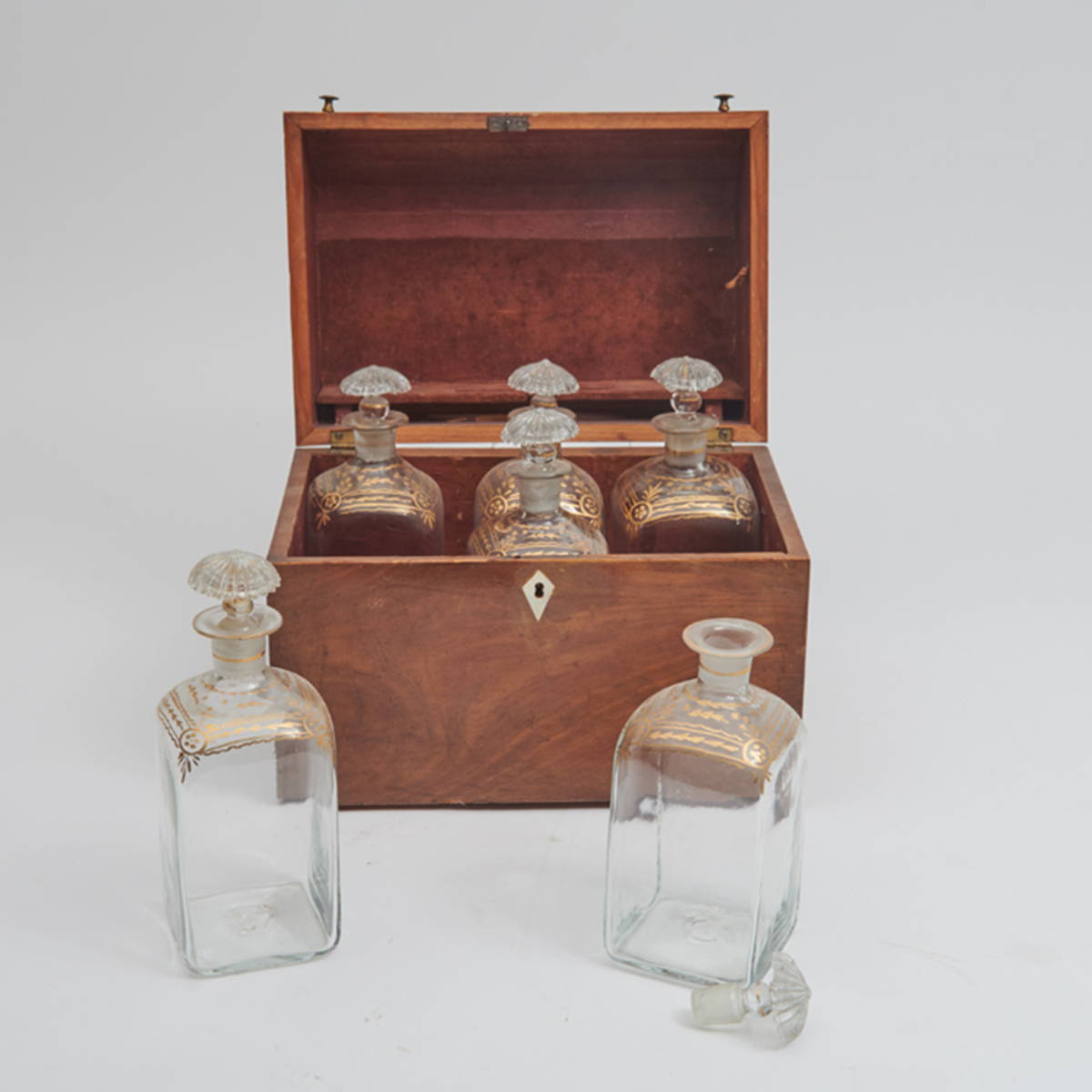 The chest with curved top to front, horn escutcheon the red painted paper interior housing six hand-blown glass decanters with parcel gilt trim.