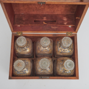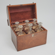 Condition: Case with wear and patina throughout, horizontal crack to top on both sides. Bottles with light chips to stoppers, some with residue to interiors. Wear and patina to interior. Loss to feet with various later replacements.