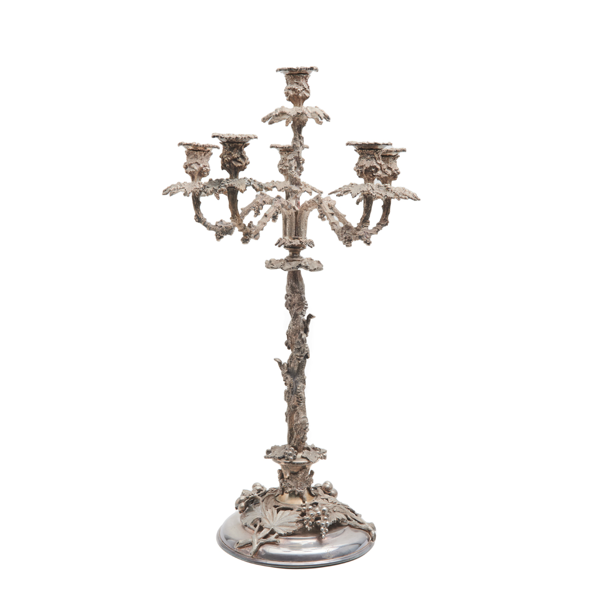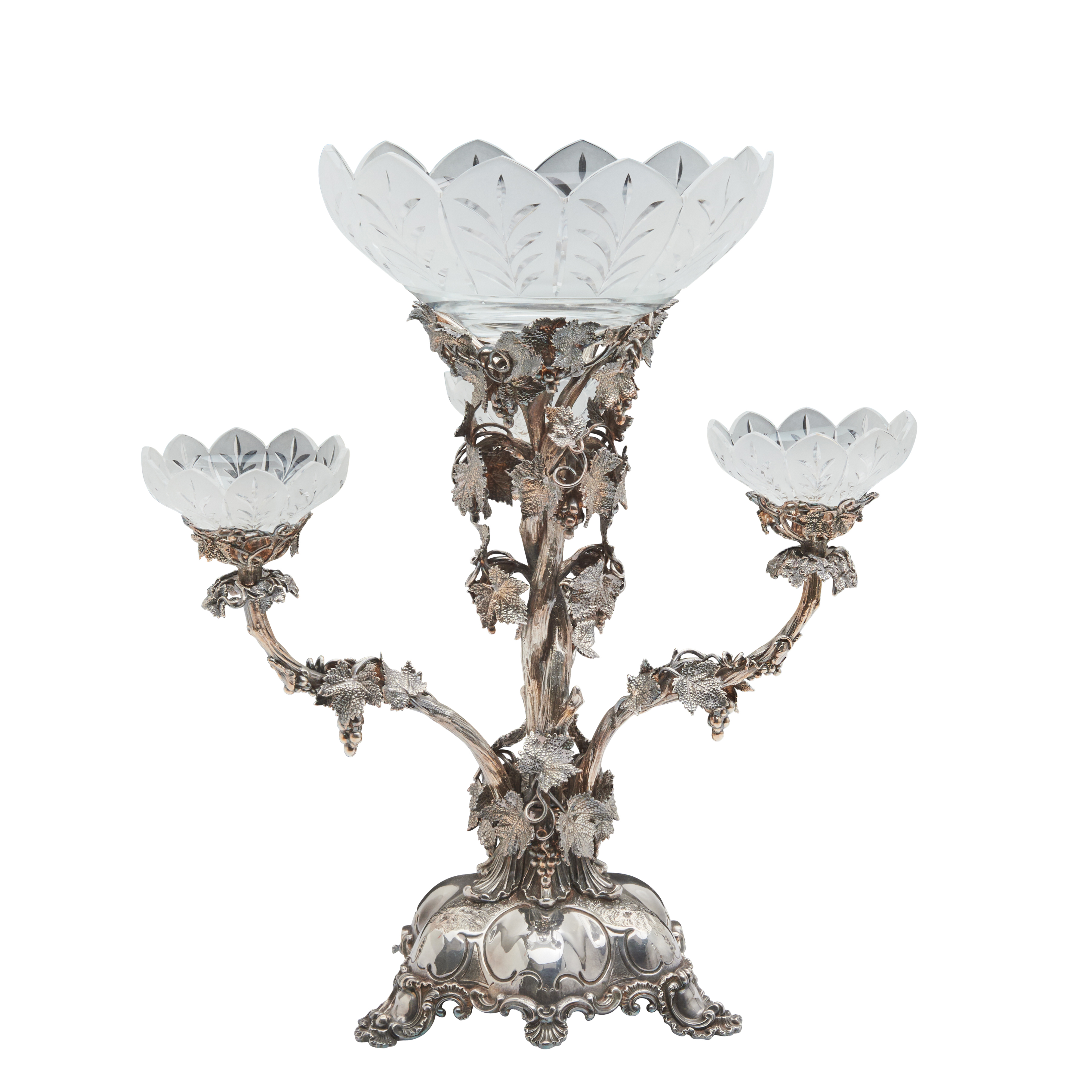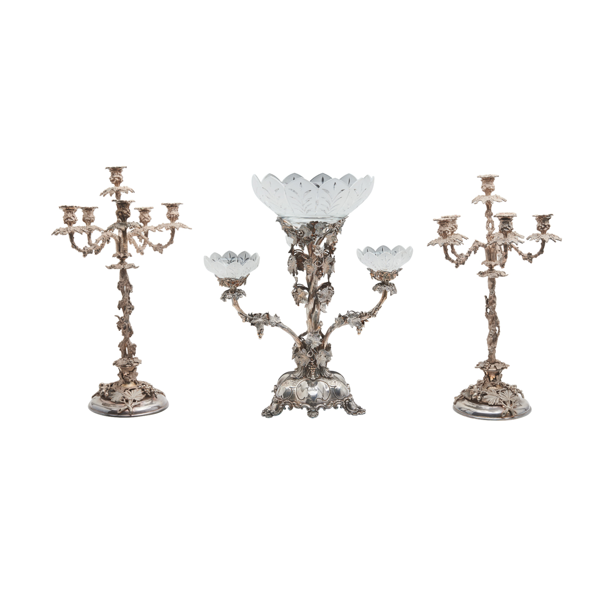 Married set comprising pair of six-light candelabra and Thomas Bradbury Sons four-bowl epergne all with grapevine motif.