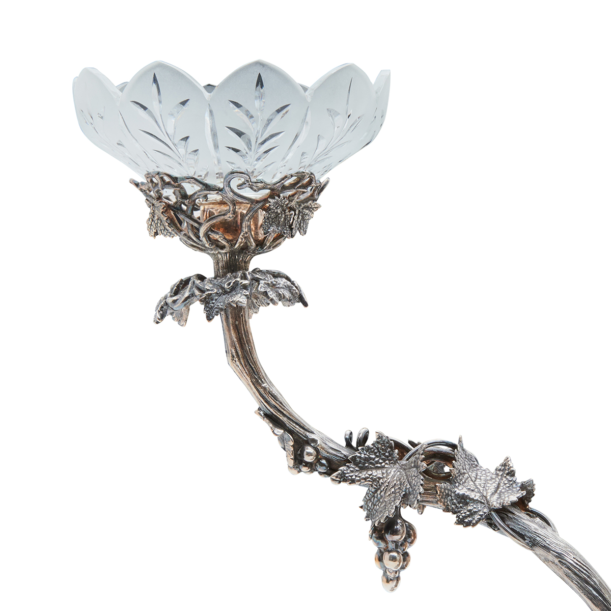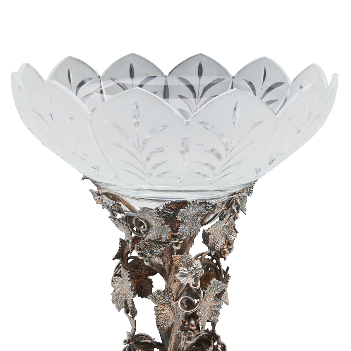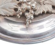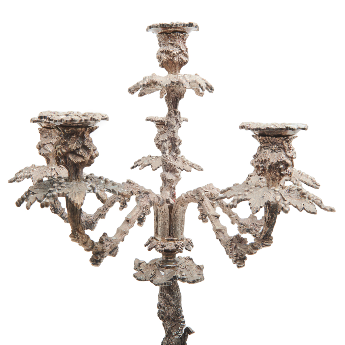 Married set comprising pair of six-light candelabra and Thomas Bradbury Sons four-bowl epergne all with grapevine motif.