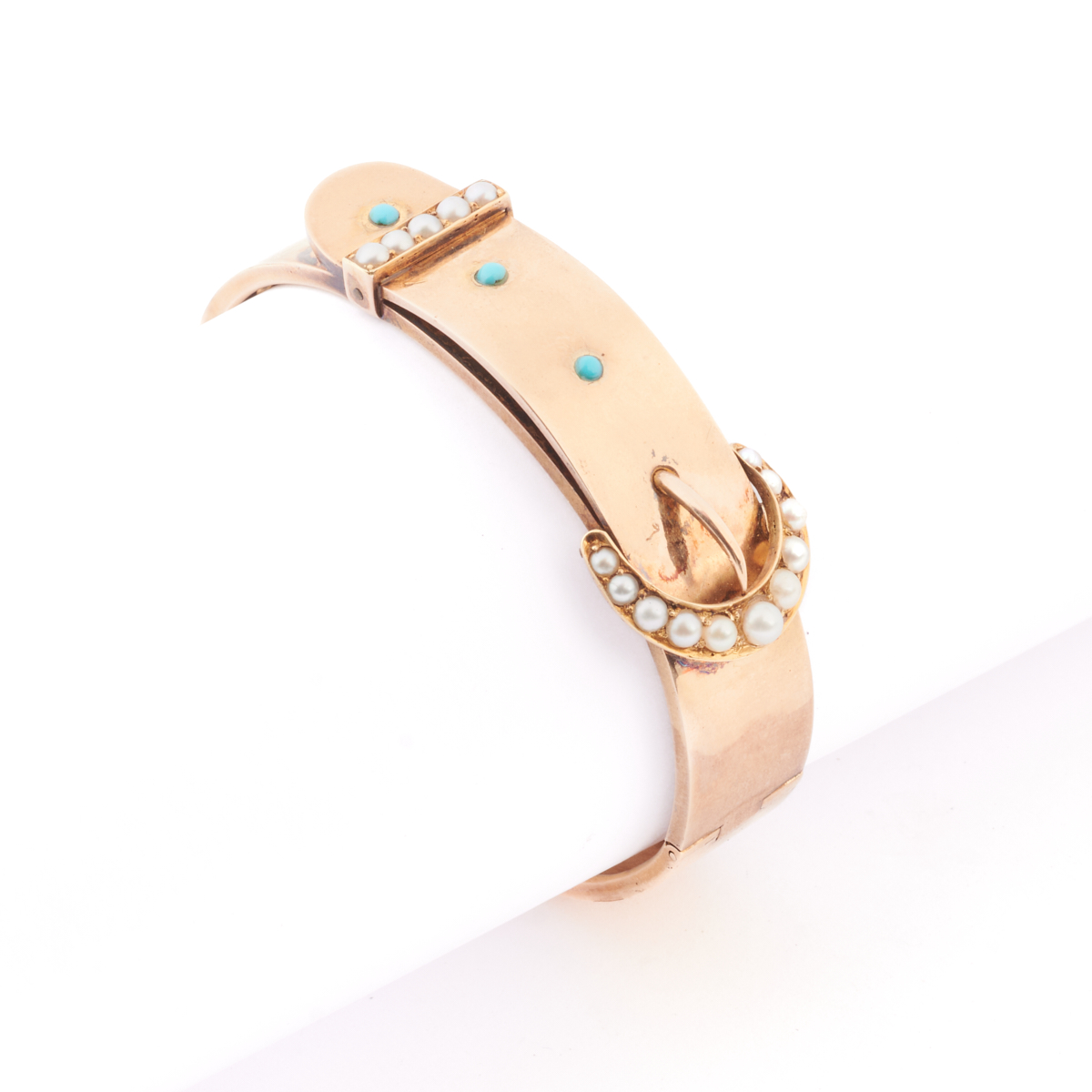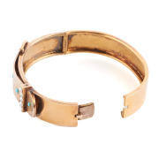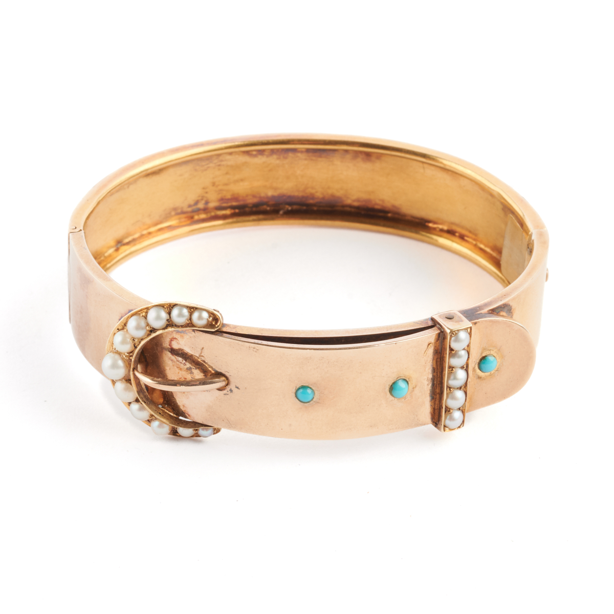 Featuring three round turquoise cabochons, accented by sixteen seed pearls, set in a 14k yellow gold buckle motif hinged bangle bracelet mounting measuring approximately 18 mm in width and with an internal diameter of approximately 54 mm.