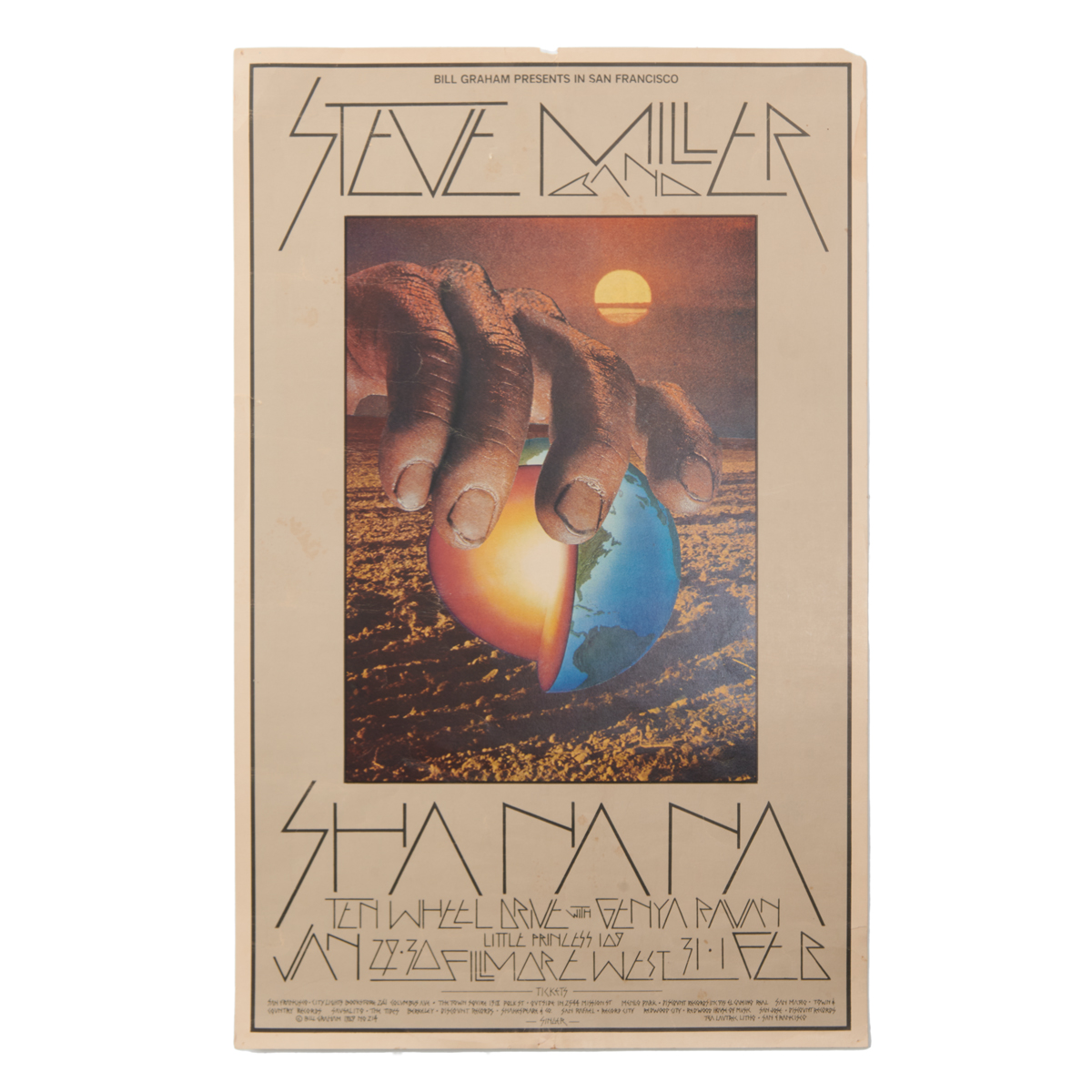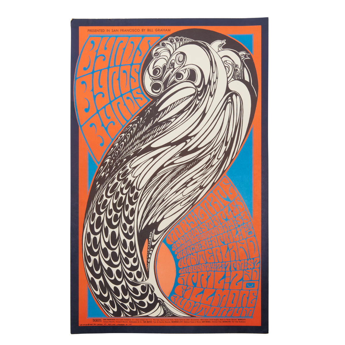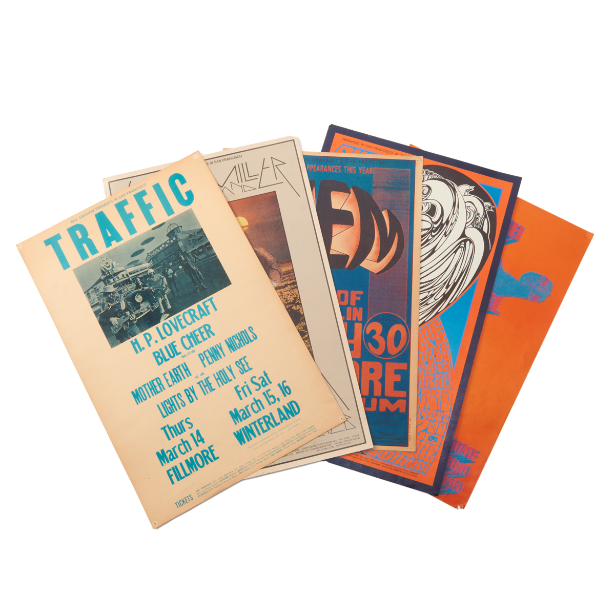 Comprising BG-214 1970 Steve Miller Band and Shanana by David Singer BG-20 1966 Them with the Sons of Champlin by Wes Wilson BG-57 1967 Byrds and Moby Grape by Wes Wilson BG-111 1968 Traffic Blue Cheer Etc. by Mouse Studios Sopwith Camel 1967 Neon Rose poster by Victor Moscoso.