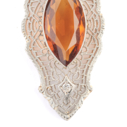 Featuring one marquise-cut citrine weighing approximately 2.85 cts., flanked by two old European-cut diamonds weighing a total of approximately 0.04 cttw., set in a 14k white gold filigree mounting measuring approximately 46 x 17 mm.