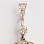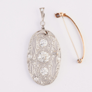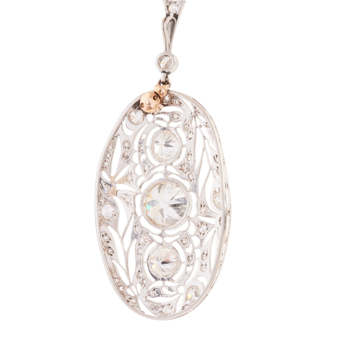 Centering one old European-cut diamond measuring approximately 7.9 x - 7.82 x 5.8 mm and weighing approximately 2.18 cts., flanked by two old European-cut diamonds weighing a total of approximately 1.00 cttw., further accented by old round-cut and rose-cut diamonds weighing a total of approximately 0.35 cttw., set in a platinum filigree mounting measuring approximately 52 x 23 mm. Total diamond weight is approximately 3.53 cttw.