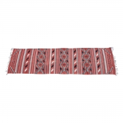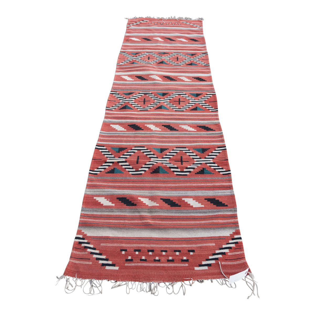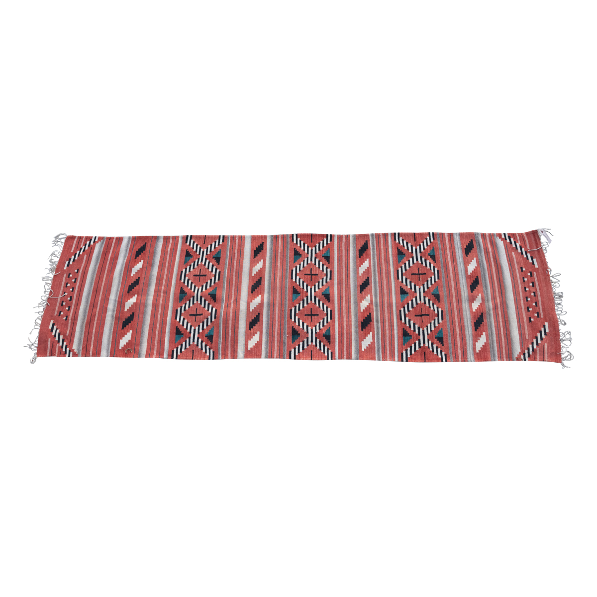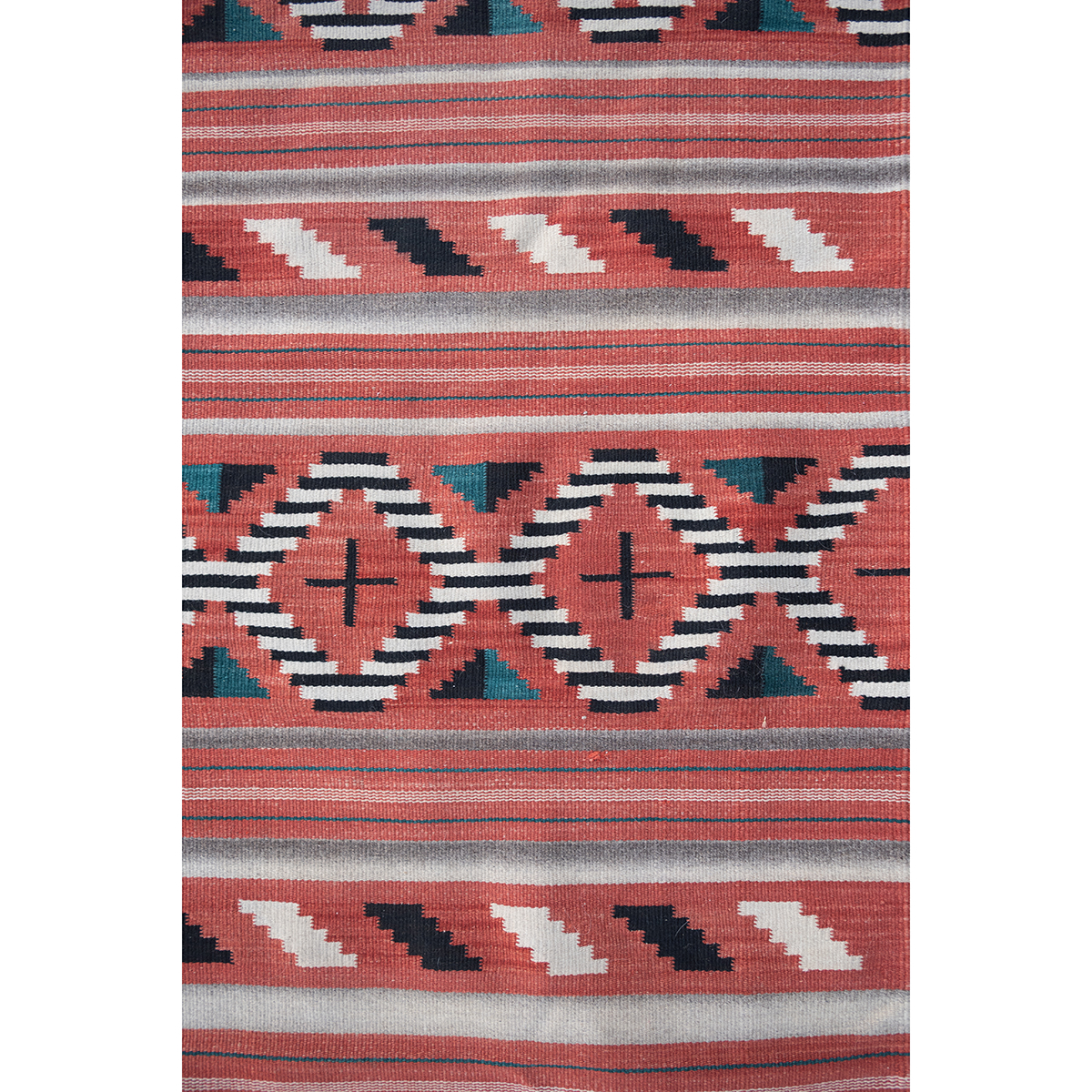 Woven in red, black, white, blue, and gray tones geometric motif throughout.