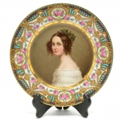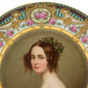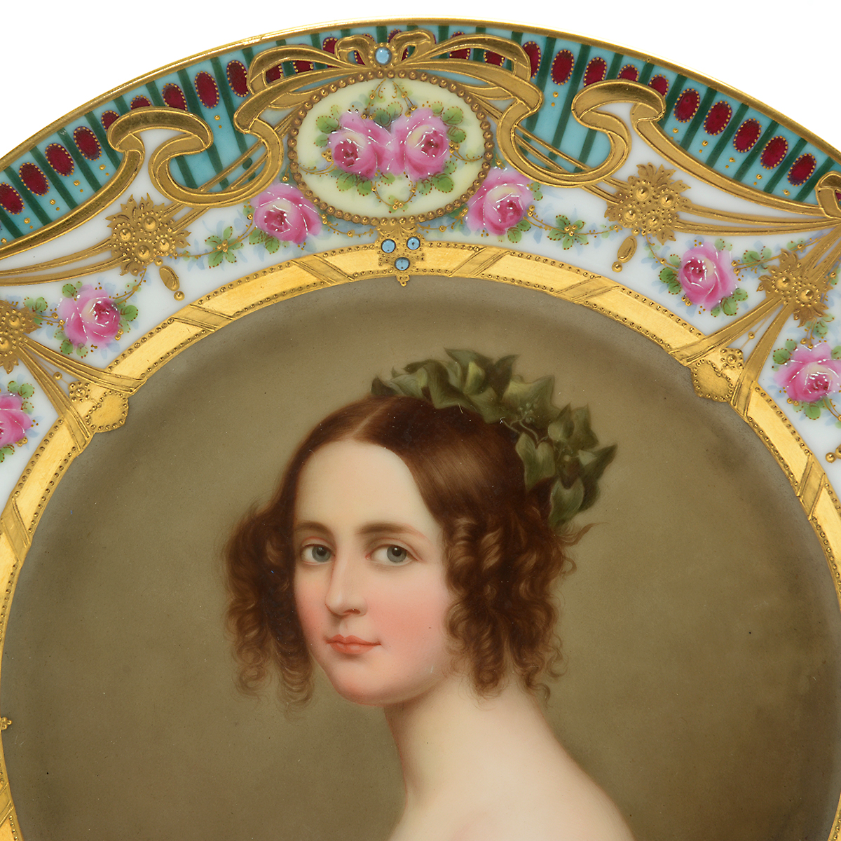 Central portrait after Joseph Karl Stieler depicting Alexandra Princess to the King of Bayern framed by a gilt inner border accented with gilt and light blue beads, surrounded by a white ground with floral and gilt swags, with a blue outer border decorated with red accents.