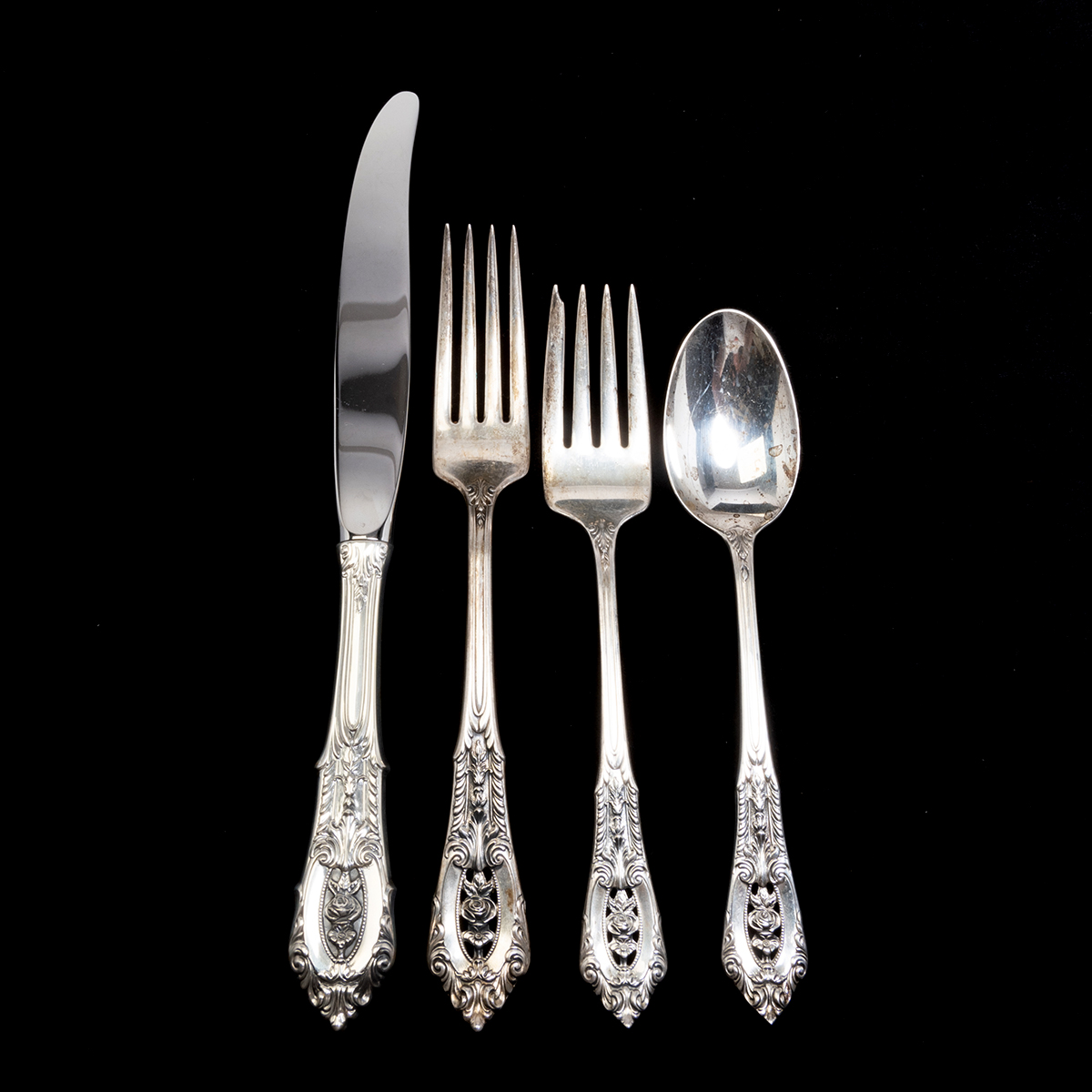 Comprising 12 place knives, 12 place forks, 12 salad forks, 12 teaspoons.