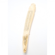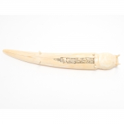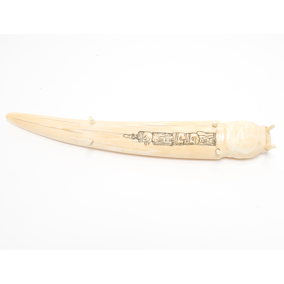 Carved in the form of a Walrus head raised on four small legs, engraved with bear towards the end, and totem pole to the underside.