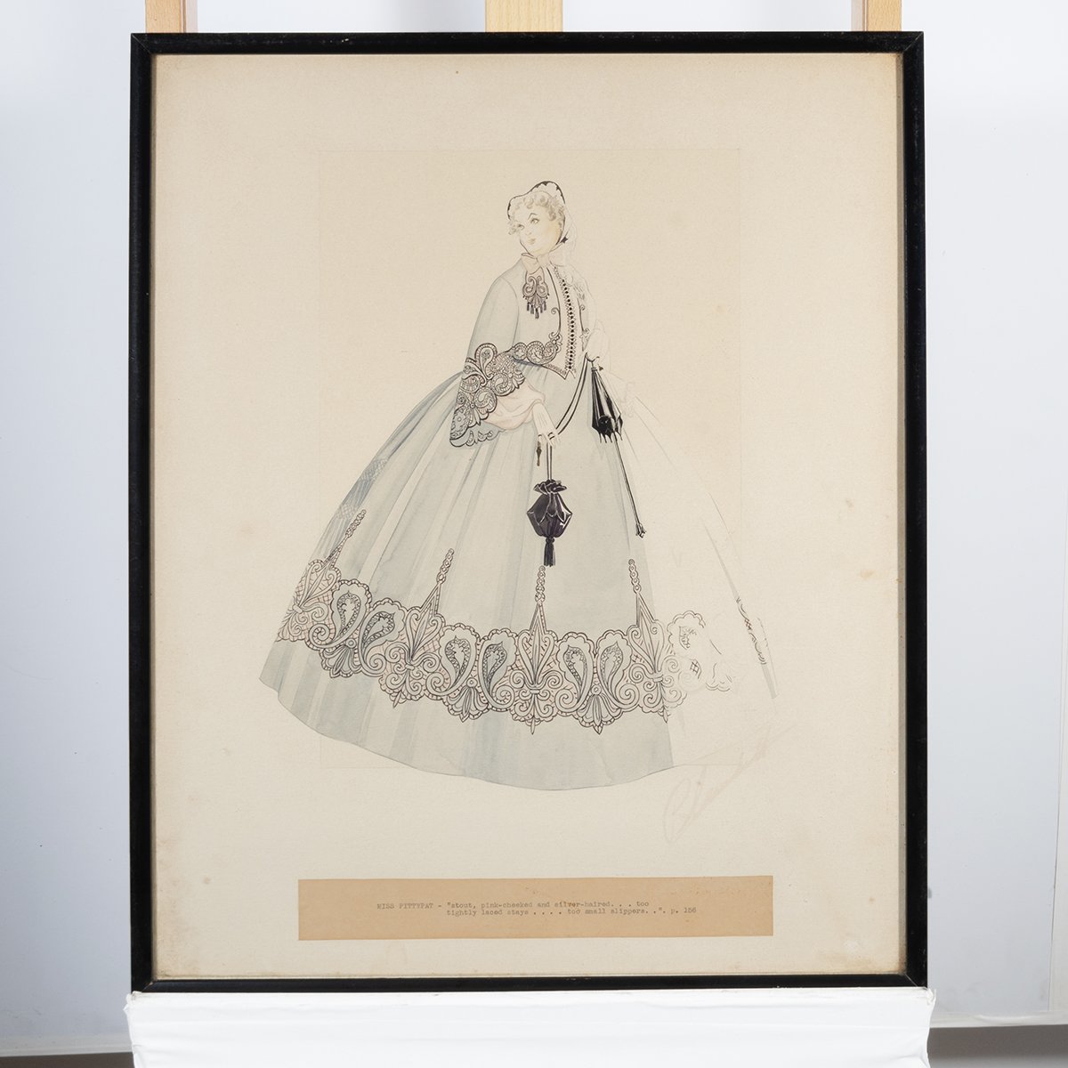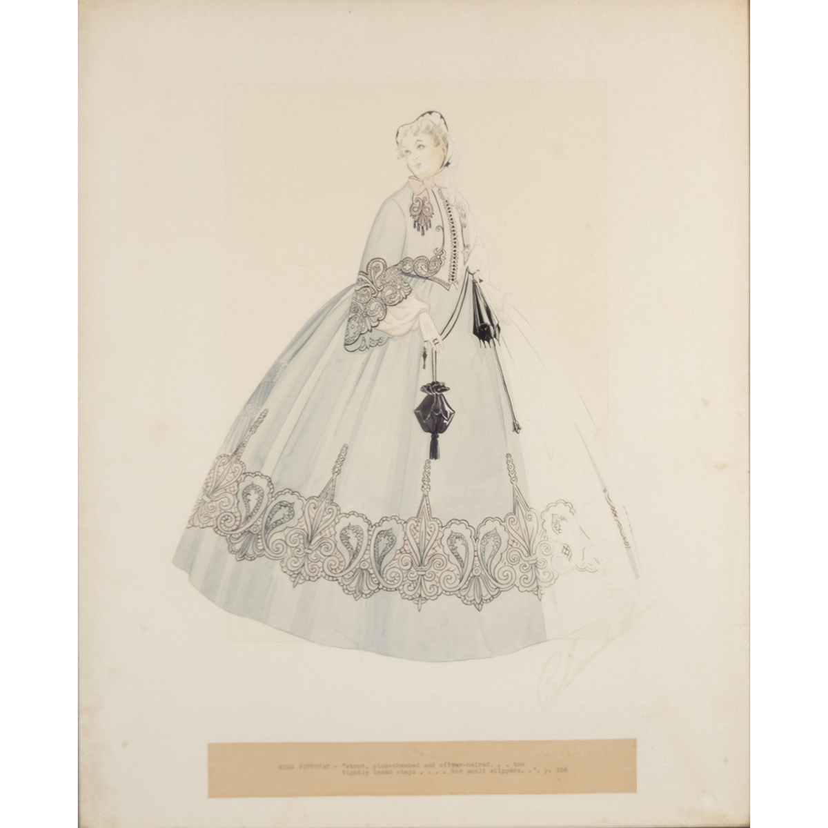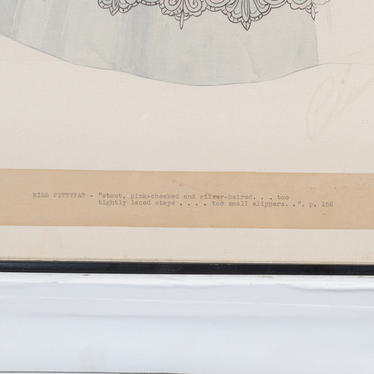 typed text MISS PITTYPAT - stout, pink-cheeked and silver-haired...too tightly laced stays....too small slippers.... p. 156 at lower margin, and signed lower right