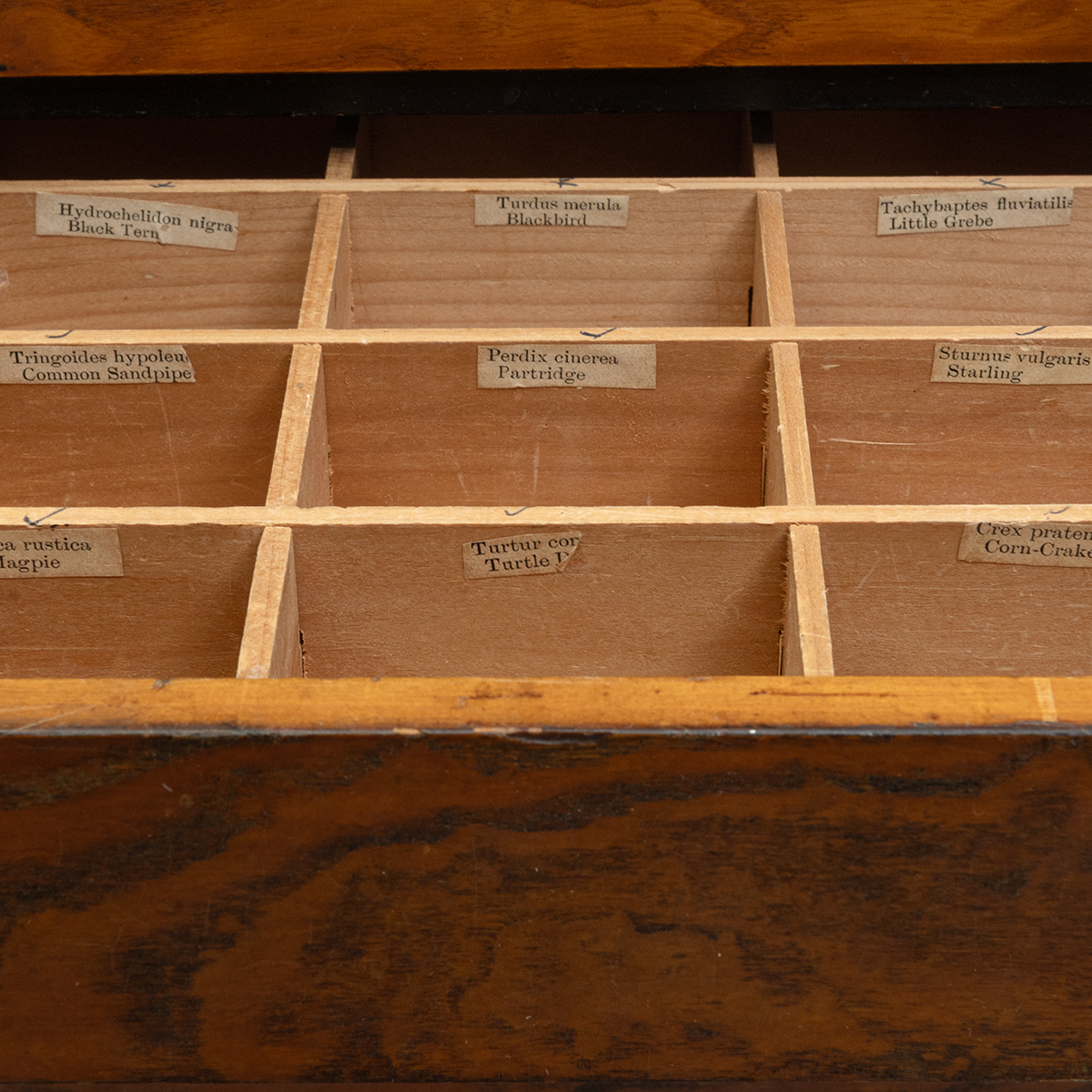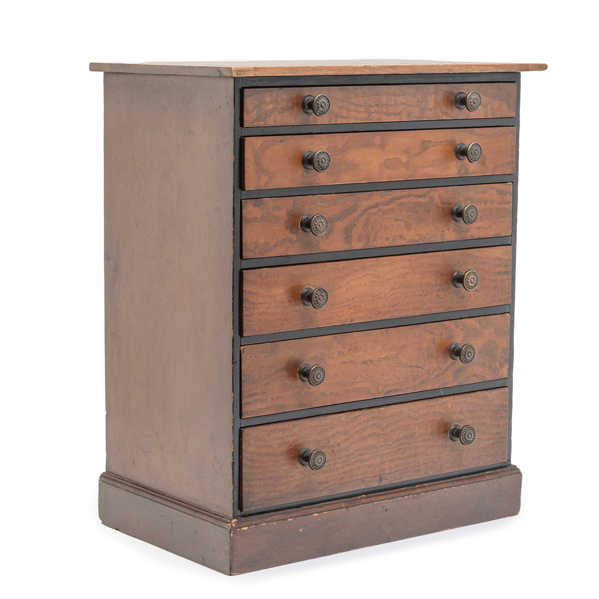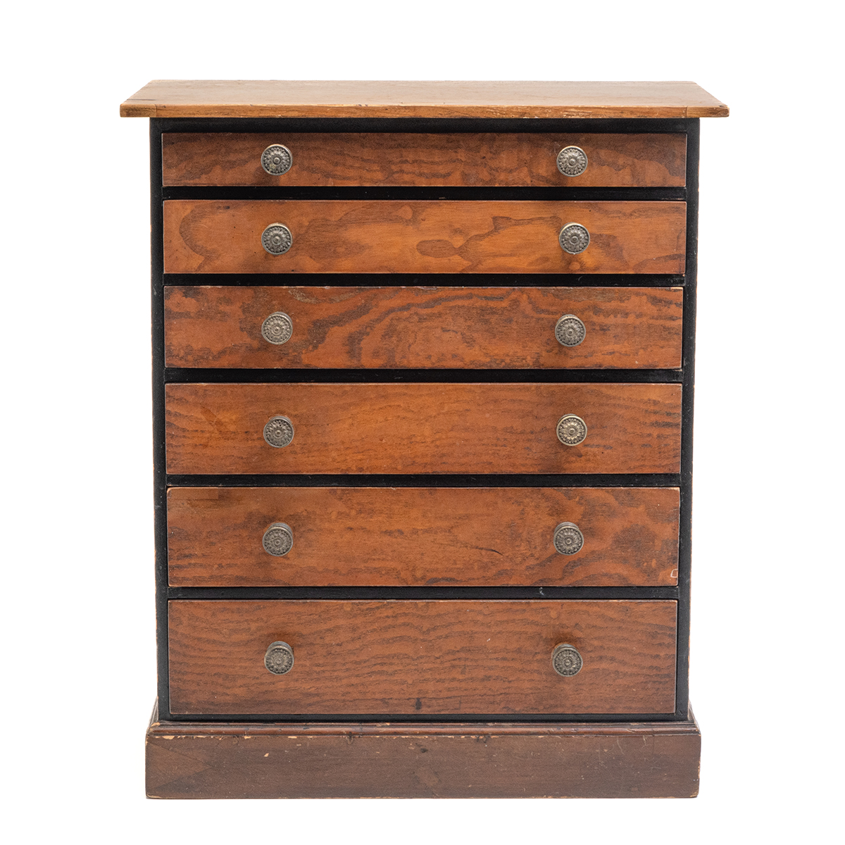 Six graduated drawers, parcel ebonized trim, round pulls the drawers divided into 122 total sections with individual labels.