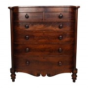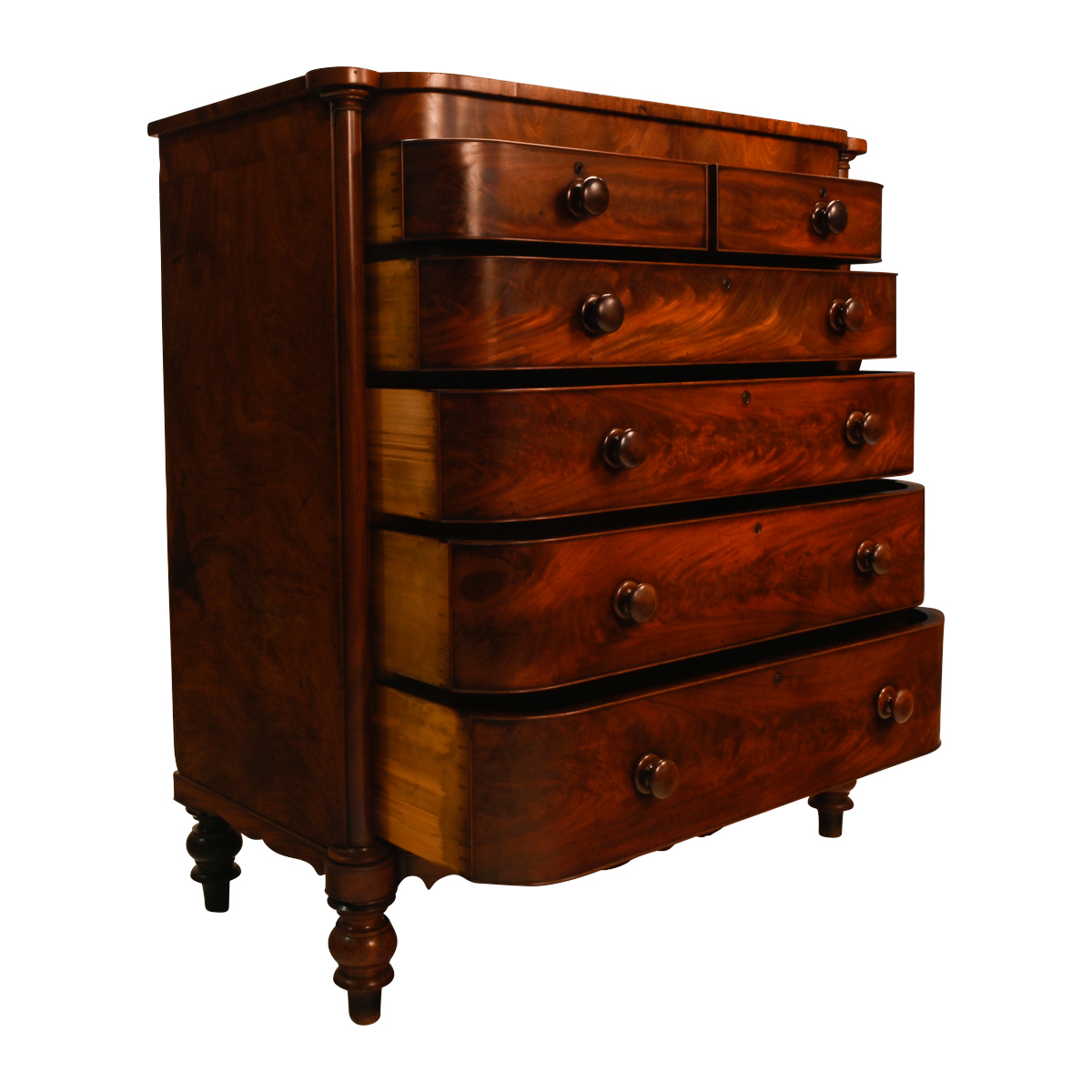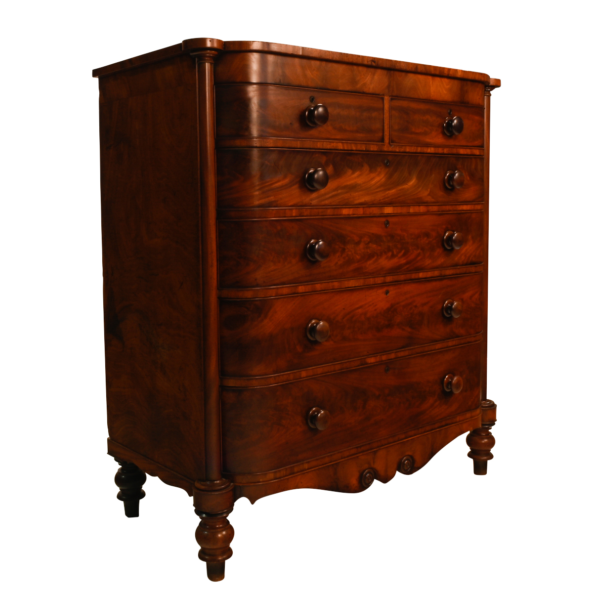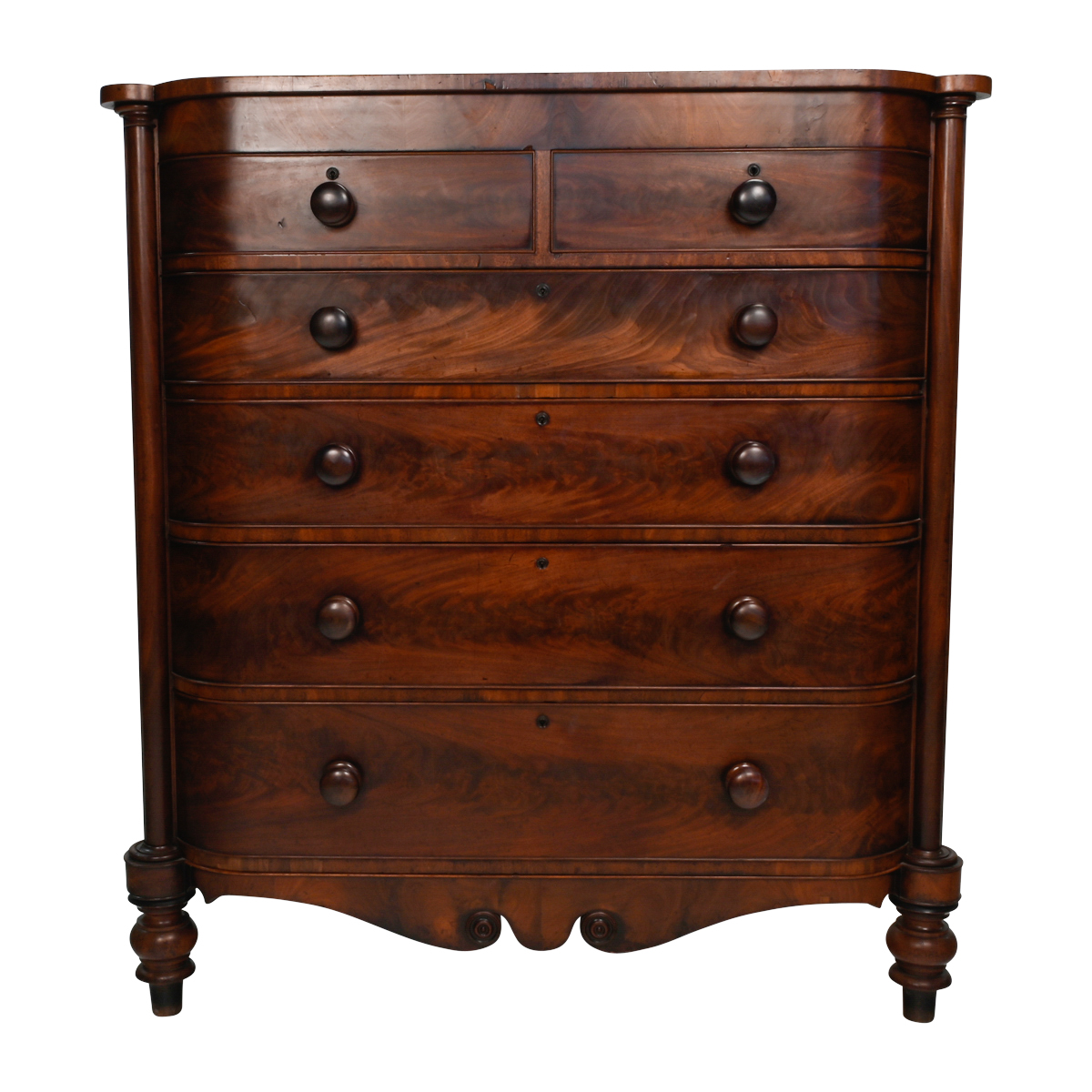 Two short drawers over four long graduated drawers, round pulls, the drawers flanked by engaged columns, shaped apron with scroll carvings, all resting on baluster carved feet.