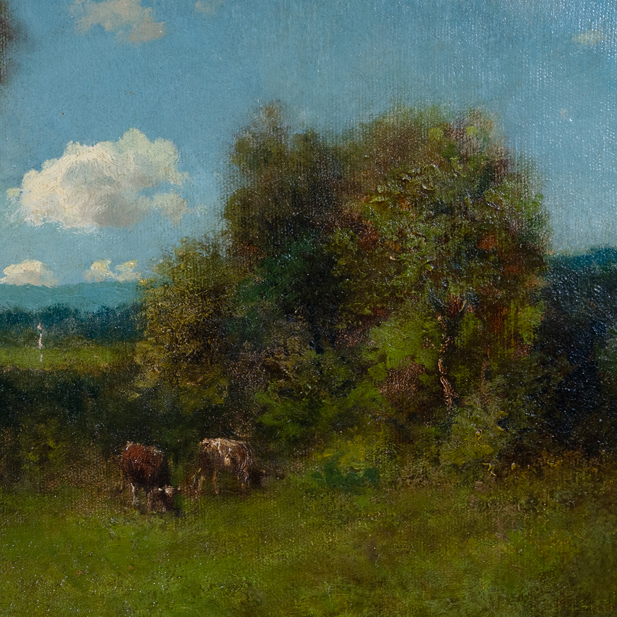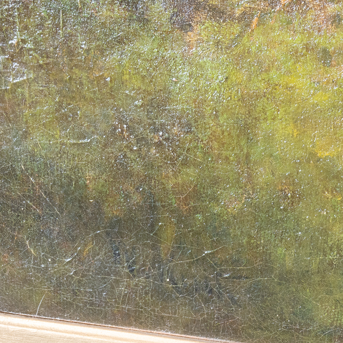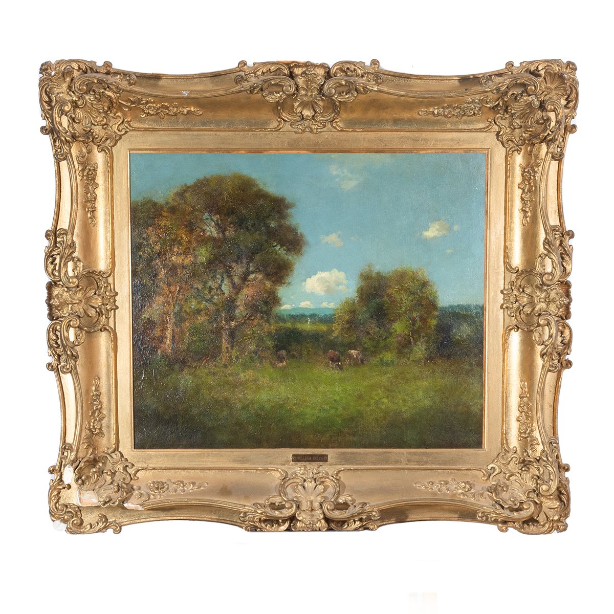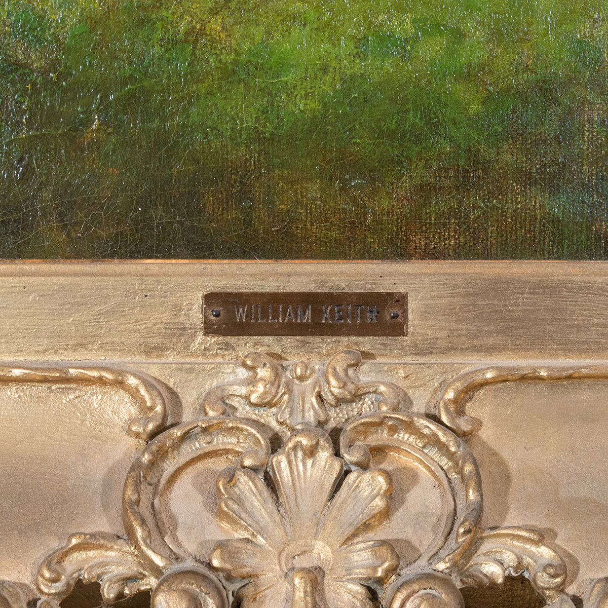 Notes: Frame is fragile, shows wear, and existing repairs, approximate dimensions - framed: 31-1/4 x 35 inches. Bio: Associated with John Muir, Keith traveled extensively to create illustrations for Muirs Picturesque California. Keith was part of a group of friends in the bay area who were associates of Muir and who supported the establishment of Yosemite National Park as well as the Sierra Club. Influenced by the French Barbizon painters, as well as American painter George Inness, he was a prolific artist, creating paintings which depict many of the most visually striking and historically significant areas of California. During the 1870s, he produced a number of 6 x10 panaromas, including those now in the collections of the Oakland Museum and the Mission Inn, in Riverside - hanging alongside the work of his peers Albert Bierstadt and Thomas Hill. In the 1906 San Francisco earthquake, many of his paintings were lost in the fire which consumed his studio.