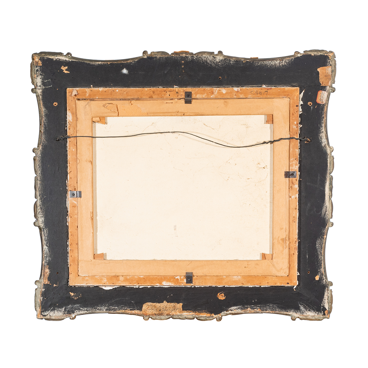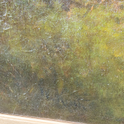 Condition: Canvas lined. Surface dust/dirt and aging cracks throughout the painting, paint chipped at center and slight abrasions. Edge of canvas taped. Visible inpaint under UV/Blacklight, especially at some areas at center, left side, and lower right. Dirt pockets and keys verso.