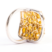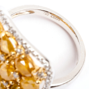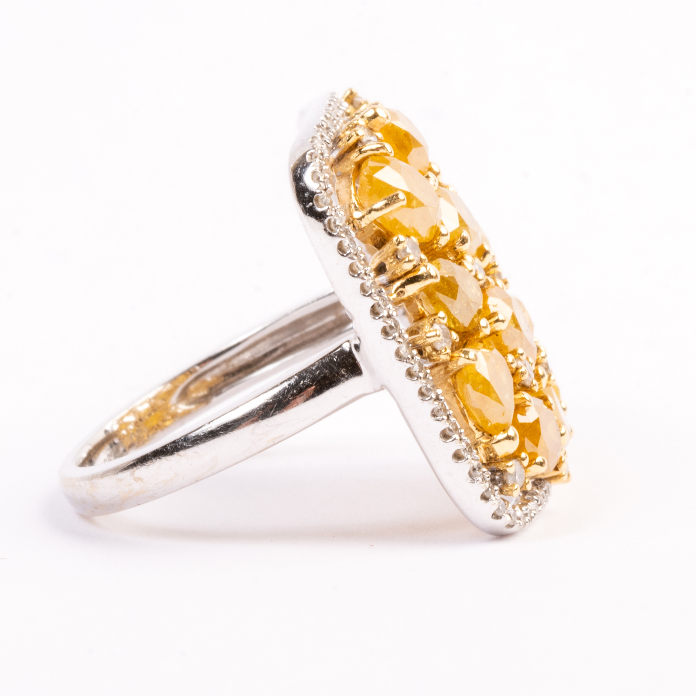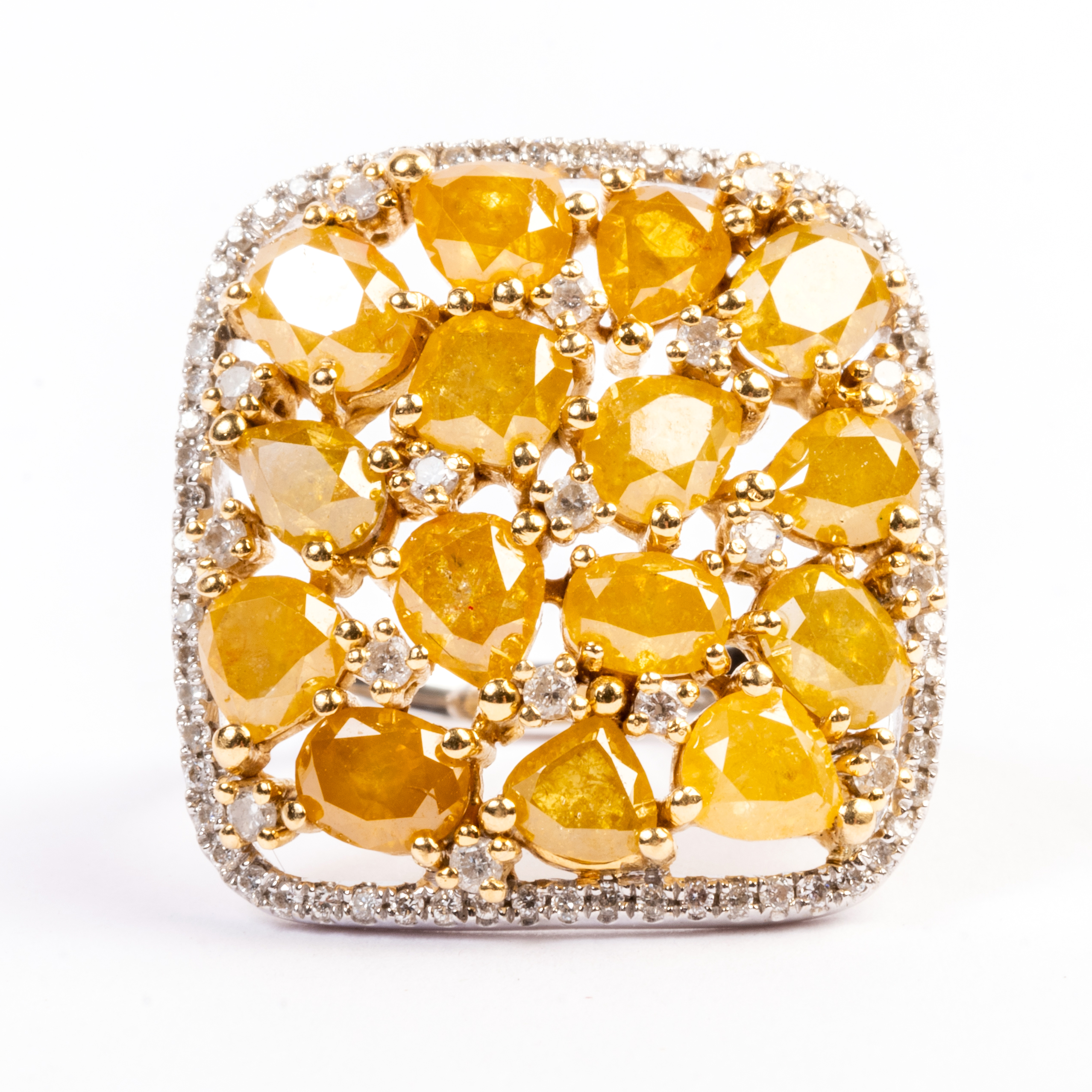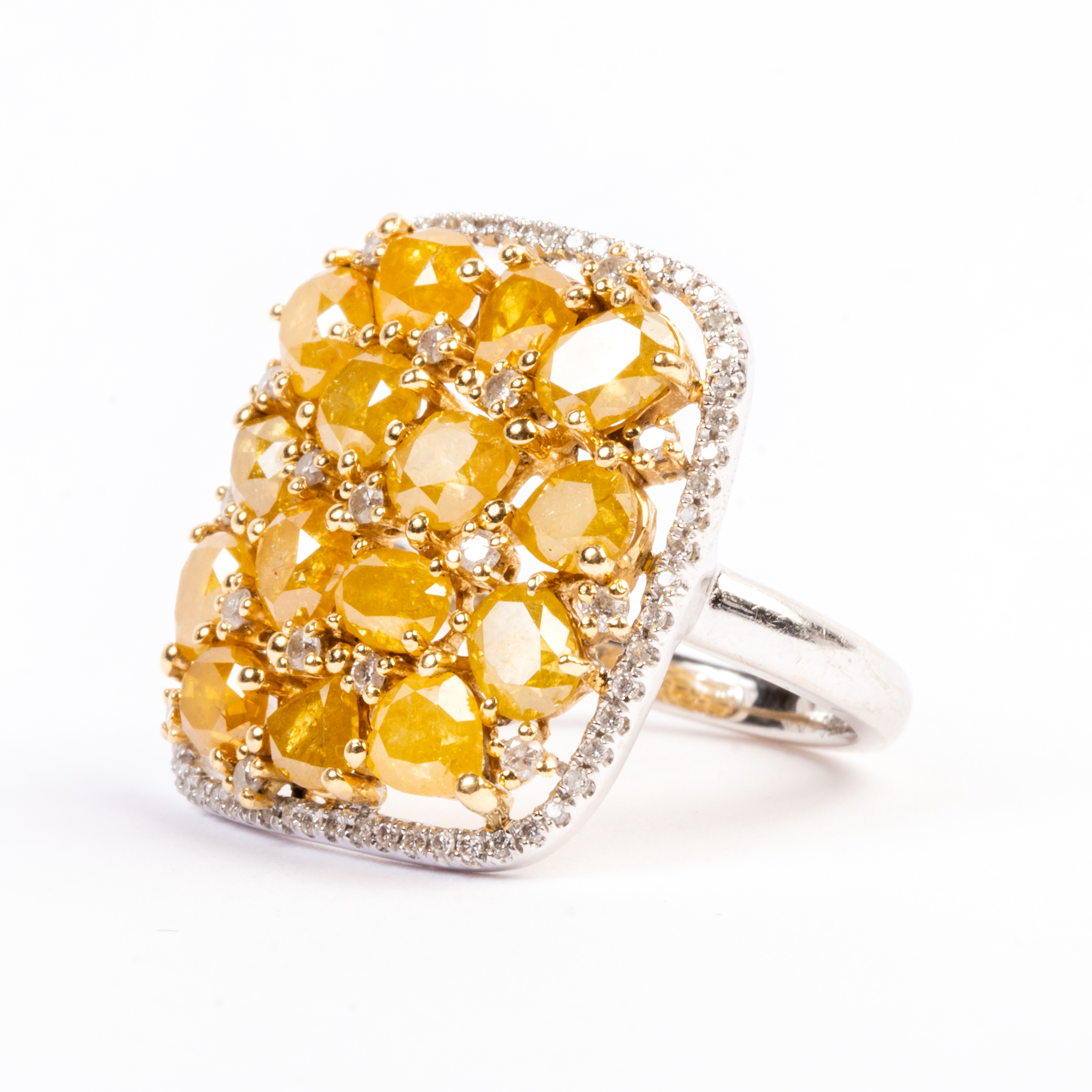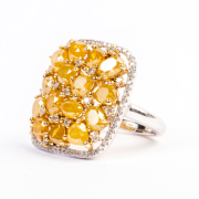 Featuring varying shaped yellow diamonds weighing a total of approximately 2.25 cttw., accented by round-cut diamonds, set in an 18k white gold mounting.